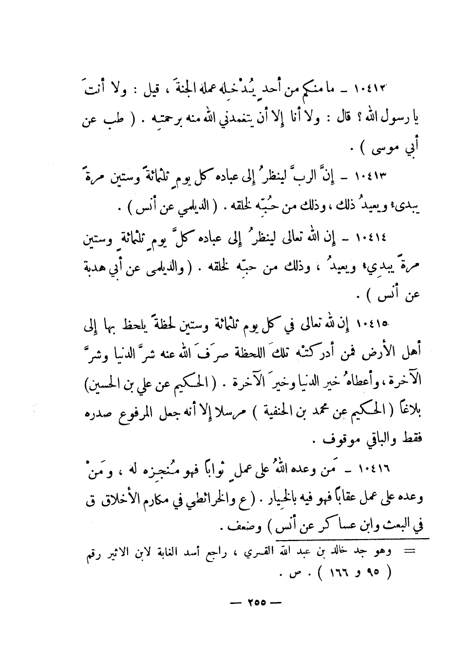 10414- "إن الله تعالى لينظر إلى عباده كل يوم ثلثمائة وستين مرة يبديء ويعيد، وذلك من حبه لخلقه". "والديلمي عن أبي هدبة عن أنس".