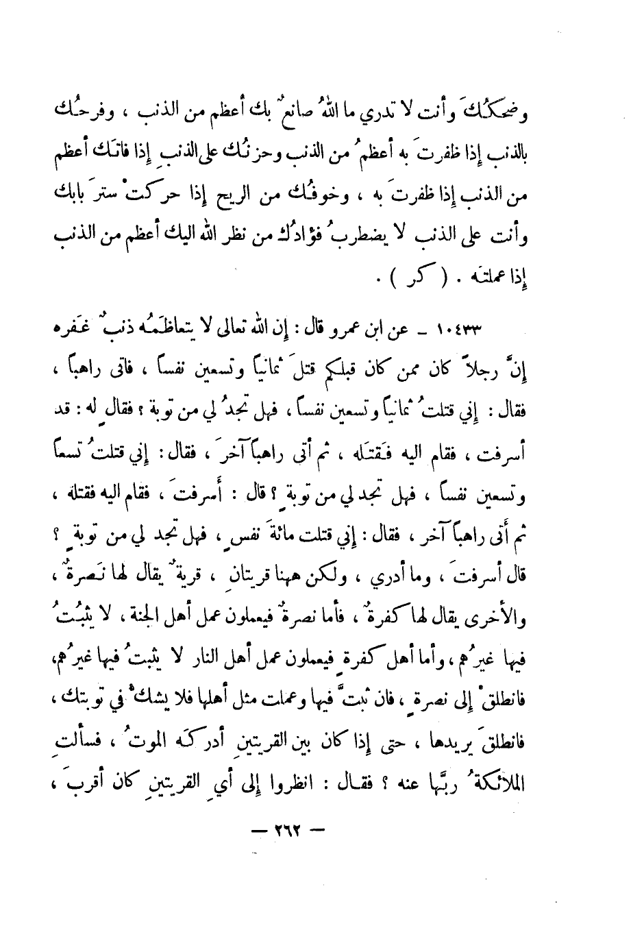 10433- "عن ابن عمرو قال: إن الله تعالى لا يتعاظمه ذنب غفره إن رجلا كان ممن كان قبلكم قتل ثمانيا وتسعين نفسا، فأتى راهبا، فقال: إني قتلت ثمانيا وتسعين نفسا، فهل تجد لي من توبة؟ فقال له: قد أسرفت، فقام إليه فقتله، ثم أتى راهبا آخر، فقال: إني قتلت تسعا وتسعين نفسا، فهل تجد لي من توبة؟ قال: أسرفت، فقام إليه فقتله، ثم أتى راهبا آخر، فقال: إني قتلت مائة نفس، فهل تجد لي من توبة؟ قال أسرفت، وما أدري، ولكن ههنا قريتان، قرية يقال لها نصرة، والأخرى يقال لها كفرة، فأما نصرة فيعملون عمل أهل الجنة، لا يثبت فيها غيرهم، وأما أهل كفرة فيعملون عمل أهل النار لا يثبت فيها غيرهم، فانطلق إلى نصرة، فإن ثبت فيها وعملت مثل أهلها فلا يشك في توبتك، فانطلق يريدها، حتى إذا كان بين القريتين أدركه الموت، فسألت الملائكة ربها عنه؟ فقال: انظروا إلى أي القريتين كان أقرب،