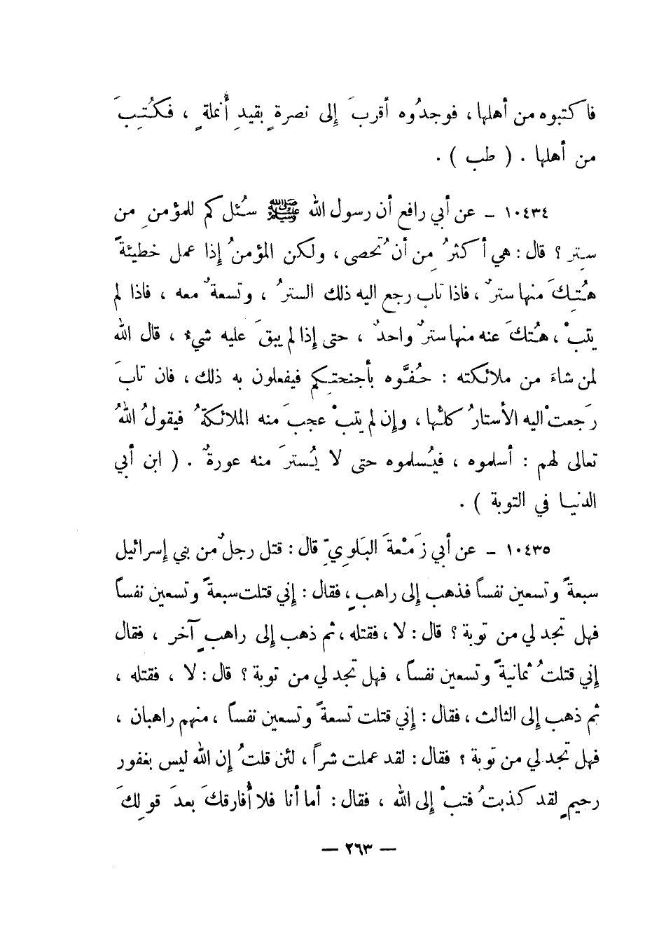 10435- "عن أبي زمعة البلوي قال: قتل رجل من بني إسرائيل سبعة وتسعين نفسا فذهب إلى راهب، فقال: إني قتلت سبعة وتسعين نفسا فهل تجد لي من توبة؟ قال: لا، فقتله، ثم ذهب إلى راهب آخر، فقال إني قتلت ثمانية وتسعين نفسا، فهل تجد لي من توبة؟ قال: لا، فقتله، ثم ذهب إلى الثالث، فقال: إني قتلت تسعة وتسعين نفسا، منهم راهبان، فهل تجد لي من توبة؟ فقال: لقد عملت شرا، لئن قلت إن الله ليس بغفور رحيم لقد كذبت فتب إلى الله، فقال: أما أنا فلا أفارقك بعد قولك