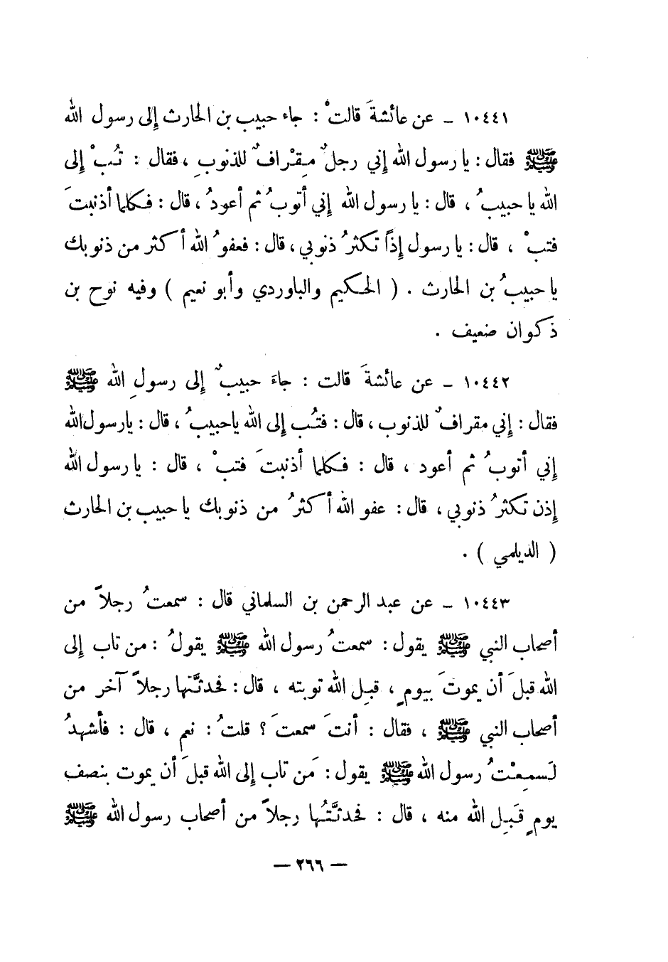 10441- "عن عائشة قالت: جاء حبيب بن الحارث إلى رسول الله صلى الله عليه وسلم فقال: يا رسول الله إني رجل مقراف للذنوب، فقال: تب إلى الله يا حبيب، قال: يا رسول الله إني أتوب ثم أعود، قال: فكلما أذنبت فتب، قال: يا رسول إذا تكثر ذنوبي، قال: فعفو الله أكثر من ذنوبك يا حبيب بن الحارث". "الحكيم والبارودي وأبو نعيم" وفيه نوح بن ذكوان ضعيف.