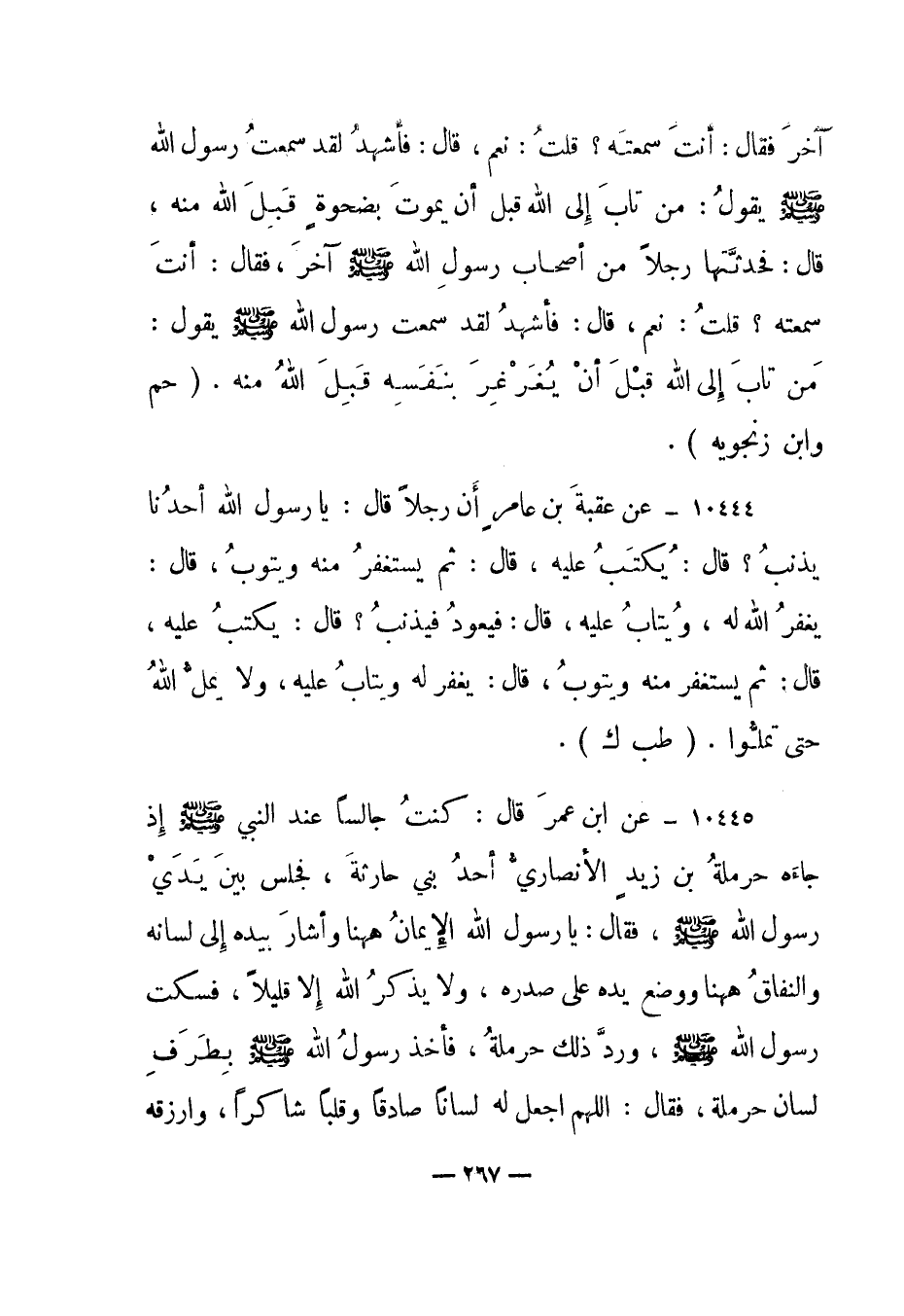 10445- عن ابن عمر قال: "كنت جالسا عند النبي صلى الله عليه وسلم إذ جاءه حرملة بن زيد الأنصاري أحد بني حارثة، فجلس بين يدي رسول الله صلى الله عليه وسلم، فقال: يا رسول الله الإيمان ههنا وأشار بيده إلى لسانه والنفاق ههنا ووضع يده على صدره، ولا يذكر الله إلا قليلا، فسكت رسول الله صلى الله عليه وسلم، ورد ذلك حرملة، فأخذ رسول الله صلى الله عليه وسلم بطرف لسان حرملة، فقال: اللهم اجعل له لسانا صادقا وقلبا شاكرا، وارزقه