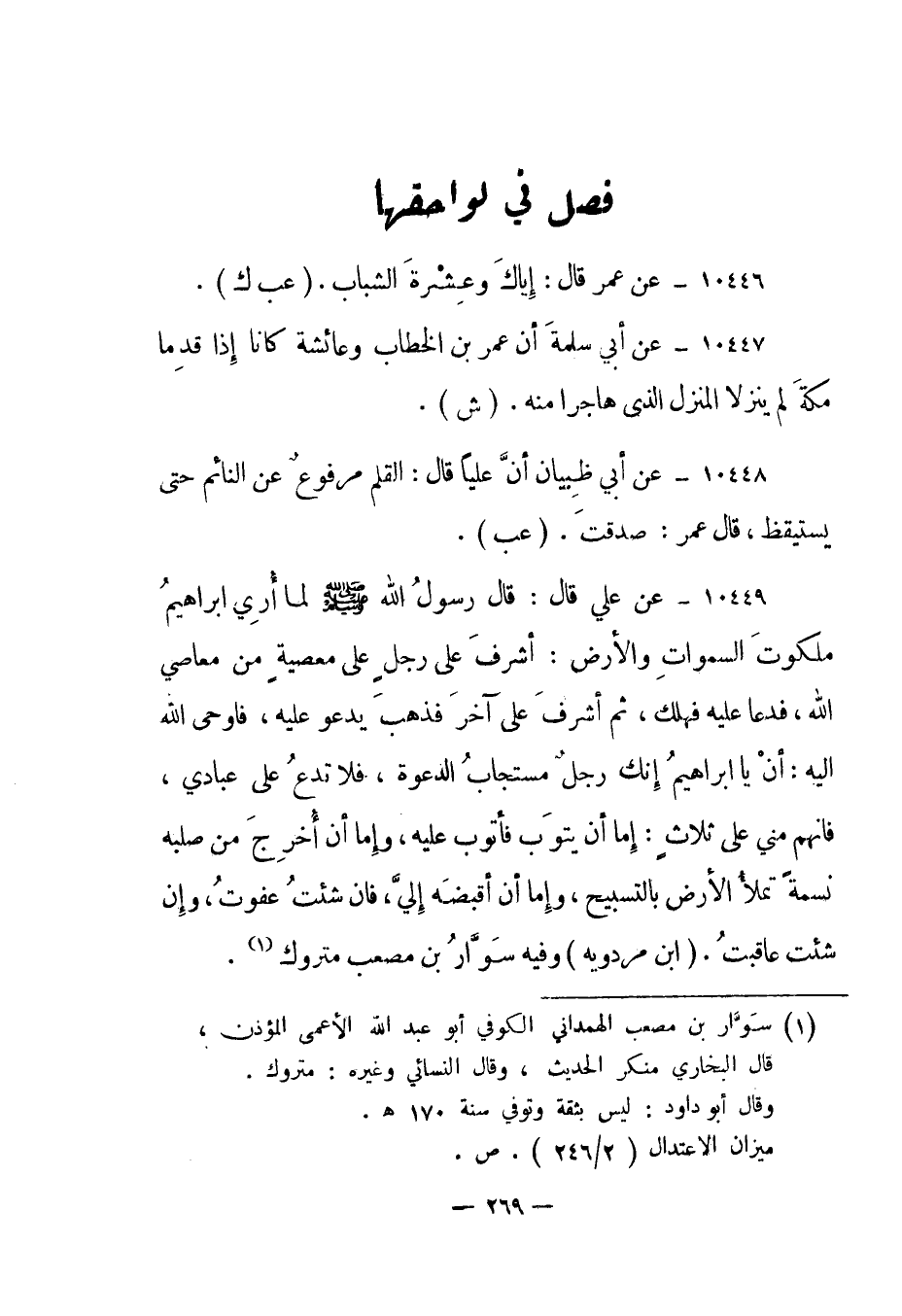 10449- عن علي قال: "قال رسول الله صلى الله عليه وسلم لما أري إبراهيم ملكوت السموات والأرض: أشرف على رجل على معصية من معاصي الله، فدعا عليه فهلك، ثم أشرف على آخر فذهب يدعو عليه، فأوحى الله إليه: أن يا إبراهيم إنك رجل مستجاب الدعوة، فلا تدع على عبادي، فإنهم مني على ثلاث: إما أن يتوب فأتوب عليه، وإما أن أخرج من صلبه نسمة تملأ الأرض بالتسبيح، وإما أن أقبضه إلي، فإن شئت عفوت، وإن شئت عاقبت". "ابن مردويه" وفيه سوار بن مصعب متروك 1.