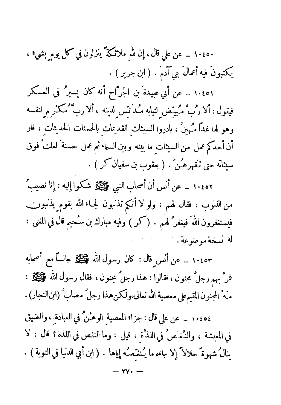 10450- عن علي قال، "إن لله ملائكة ينزلون في كل يوم بشيء، يكتبون فيه أعمال بني آدم". "ابن جرير".