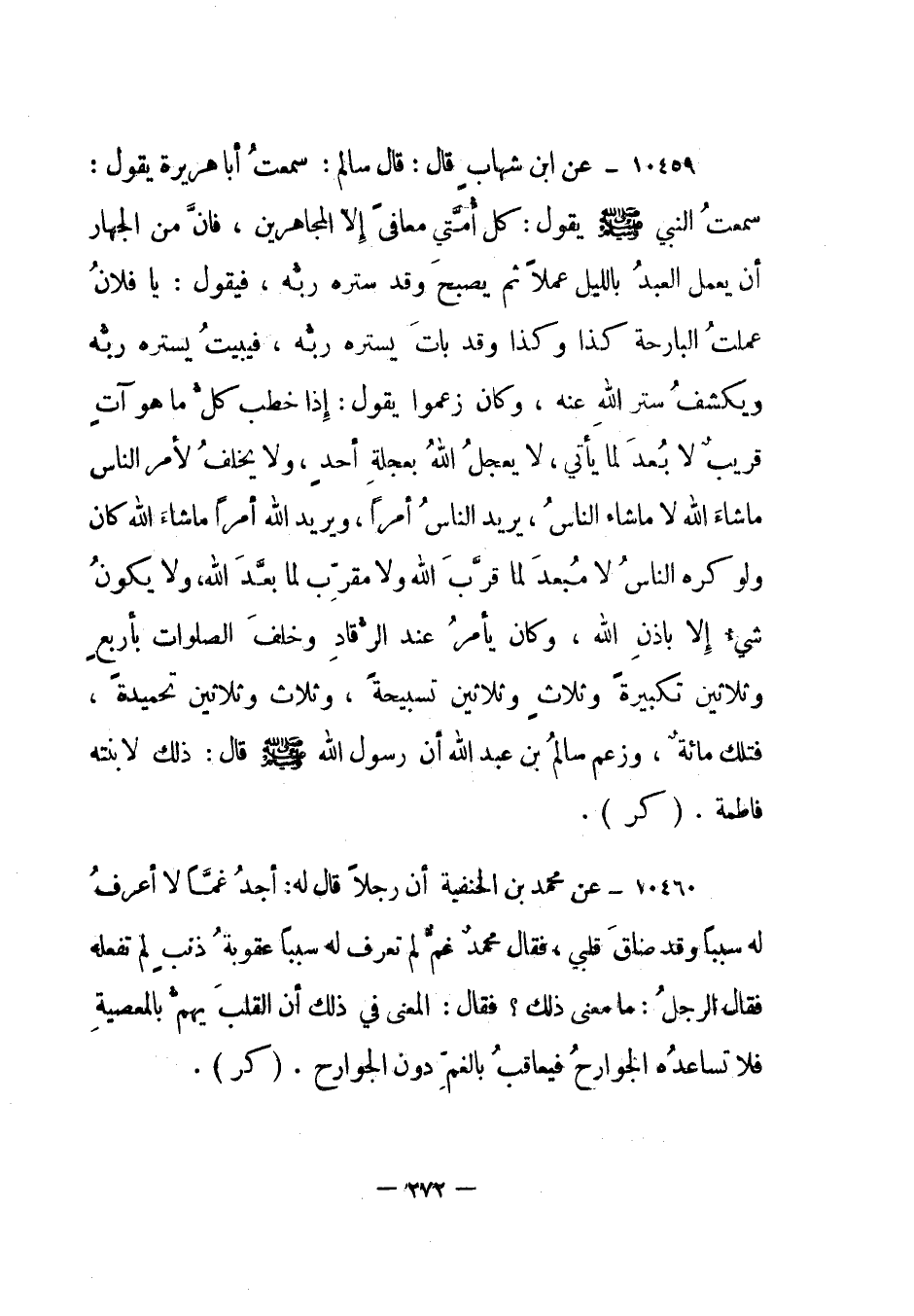 10459- عن ابن شهاب قال: قال سالم: "سمعت أبا هريرة يقول: سمعت النبي صلى الله عليه وسلم يقول: كل أمتي معافى إلا المجاهرين، فإن من الجهار أن يعمل العبد بالليل عملا ثم يصبح وقد ستره ربه، فيقول: يا فلان عملت البارحة كذا وكذا وقد بات يستره ربه، فيبيت يستره ربه ويكشف ستر الله عنه، وكان زعموا يقول: إذا خطب كل ما هو آت قريب لا بعد لما يأتي، لا يعجل الله بعجلة أحد، ولا يخلف لأمر الناس ما شاء الله لا ما شاء الناس، يريد الناس أمرا، ويريد الله أمرا ما شاء الله كان ولو كره الناس لا مبعد لما قرب الله ولا مقرب لما بعد الله، ولا يكون شيء إلا بإذن الله، وكان يأمر عند الرقاد وخلف الصلوات بأربع وثلاثين تكبيرة وثلاث وثلاثين تسبيحة، وثلاث وثلاثين تحميدة، فتلك مائة، وزعم سالم بن عبد الله أن رسول الله صلى الله عليه وسلم قال: ذلك لابنته فاطمة". "كر".