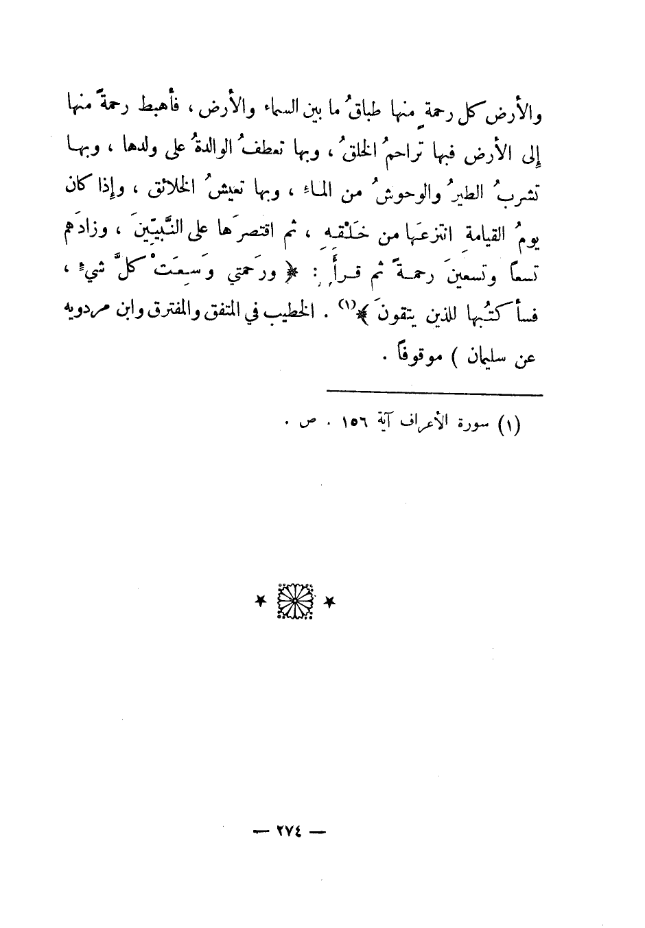 والأرض كل رحمة منها طباق ما بين السماء والأرض، فأهبط رحمة منها إلى الأرض فبها تراحم الخلق، وبها تعطف الوالدة على ولدها، وبها تشرب الطير والوحوش من الماء، وبها تعيش الخلائق، وإذا كان يوم القيامة انتزعها من خلقه، ثم اقتصرها على النبيين، وزادهم تسعا وتسعين رحمة ثم قرأ: {وَرَحْمَتِي وَسِعَتْ كُلَّ شَيْءٍ فَسَأَكْتُبُهَا لِلَّذِينَ يَتَّقُونَ} " 1. "الخطيب في المتفق والمفترق وابن مردويه عن سليمان" موقوفا.