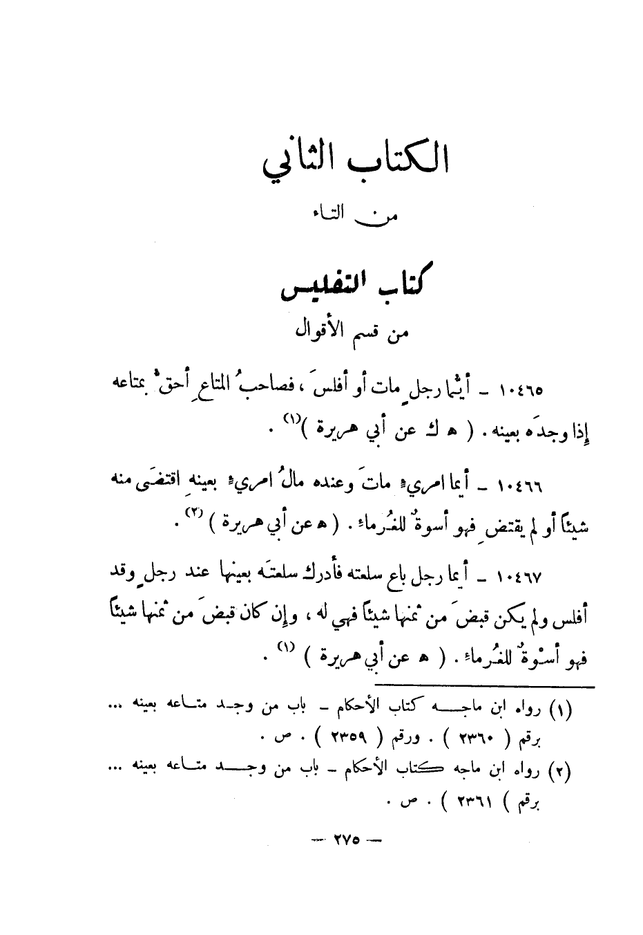 1 رواه ابن ماجه كتاب الأحكام - باب من وجد متاعه بعينه ... برقم "2360". ورقم "2359". ص.