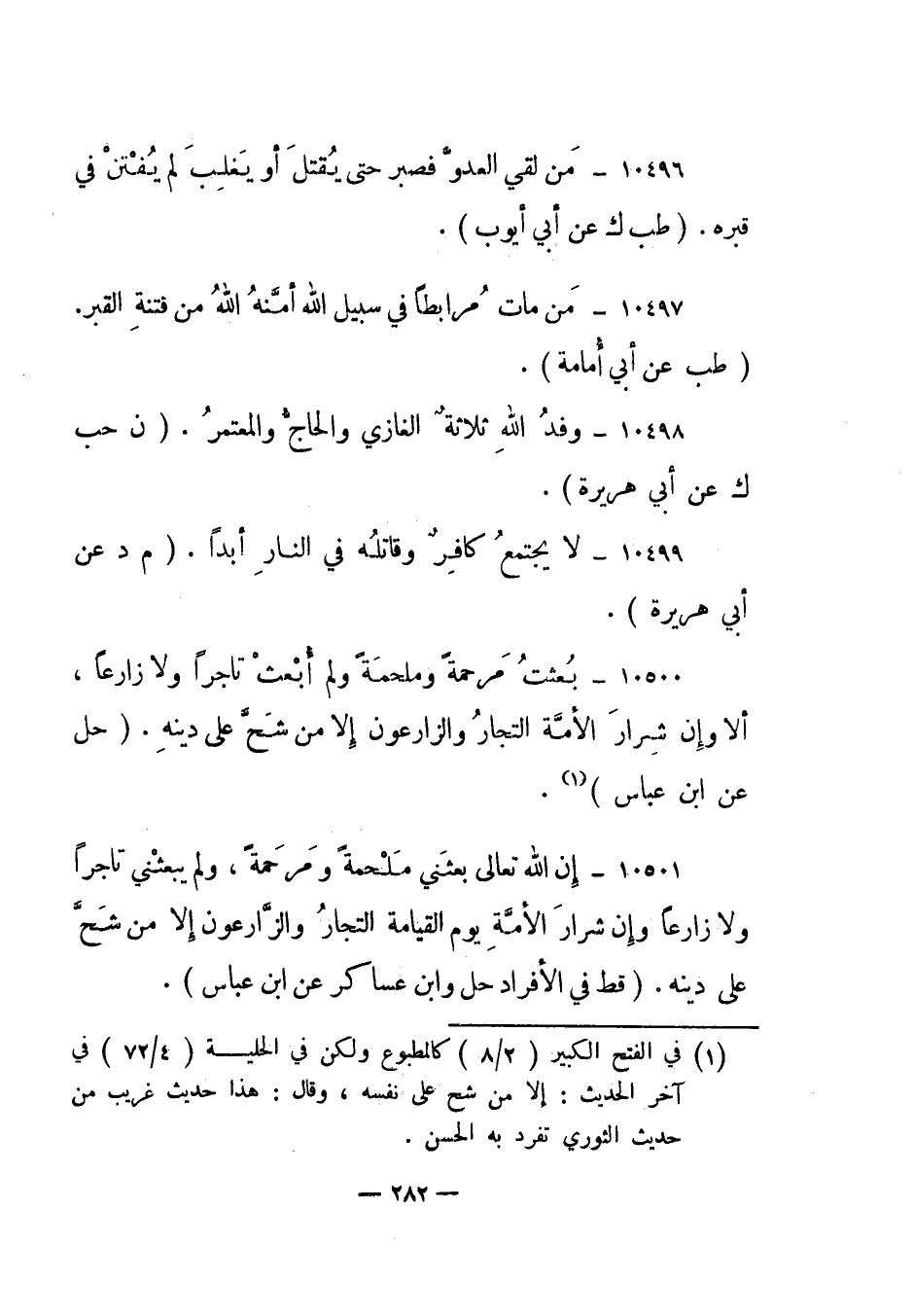 10496- "من لقي العدو فصبر حتى يقتل أو يغلب لم يفتن في قبره". "طب ك عن أبي أيوب".