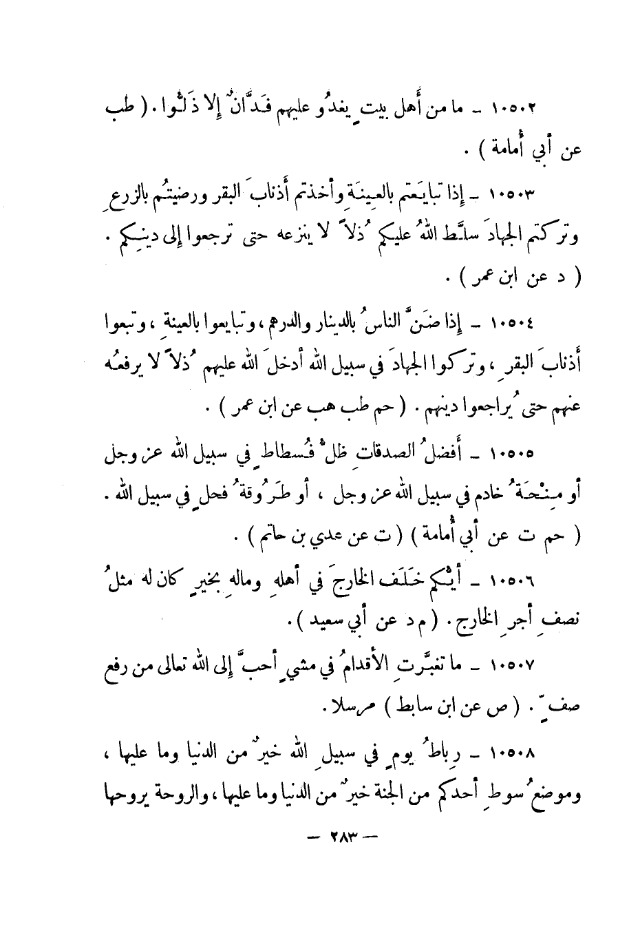 10504- "إذا ضن الناس بالدينار والدرهم، وتبايعوا بالعينة، وتبعوا أذناب البقر، وتركوا الجهاد في سبيل الله أدخل الله عليهم ذلا لا يرفعه عنهم حتى يراجعوا دينهم". "حم طب هب عن ابن عمر".