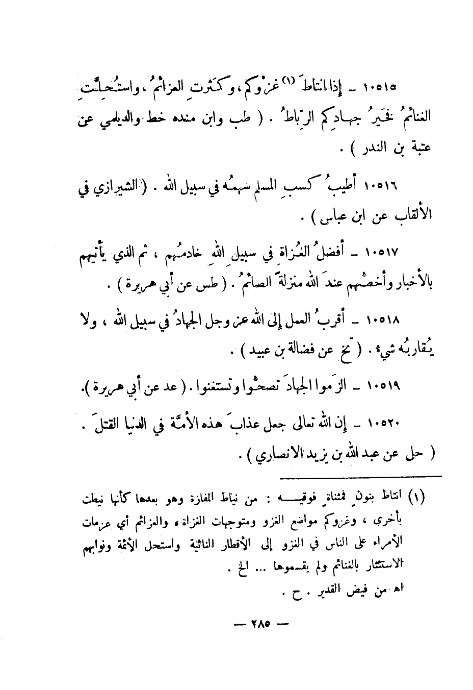 10515- "إذا انتاط 1 غزوكم، وكثرت العزائم، واستحلت الغنائم فخير جهادكم الرباط". "طب وابن منده خط والديلمي عن عتبة بن الندر".