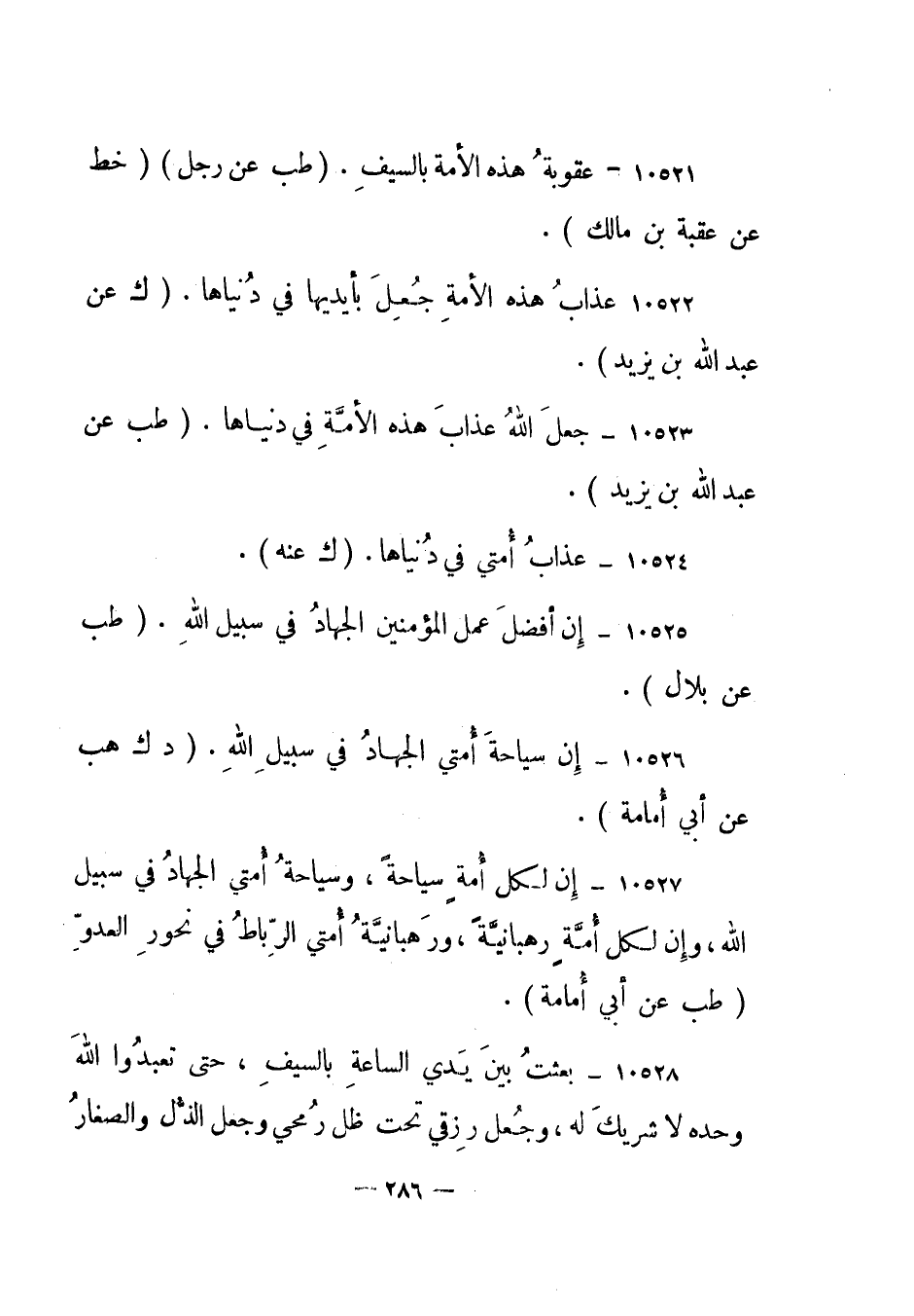 10521- "عقوبة هذه الأمة بالسيف". "طب عن رجل" "خط عن عقبة بن مالك".
