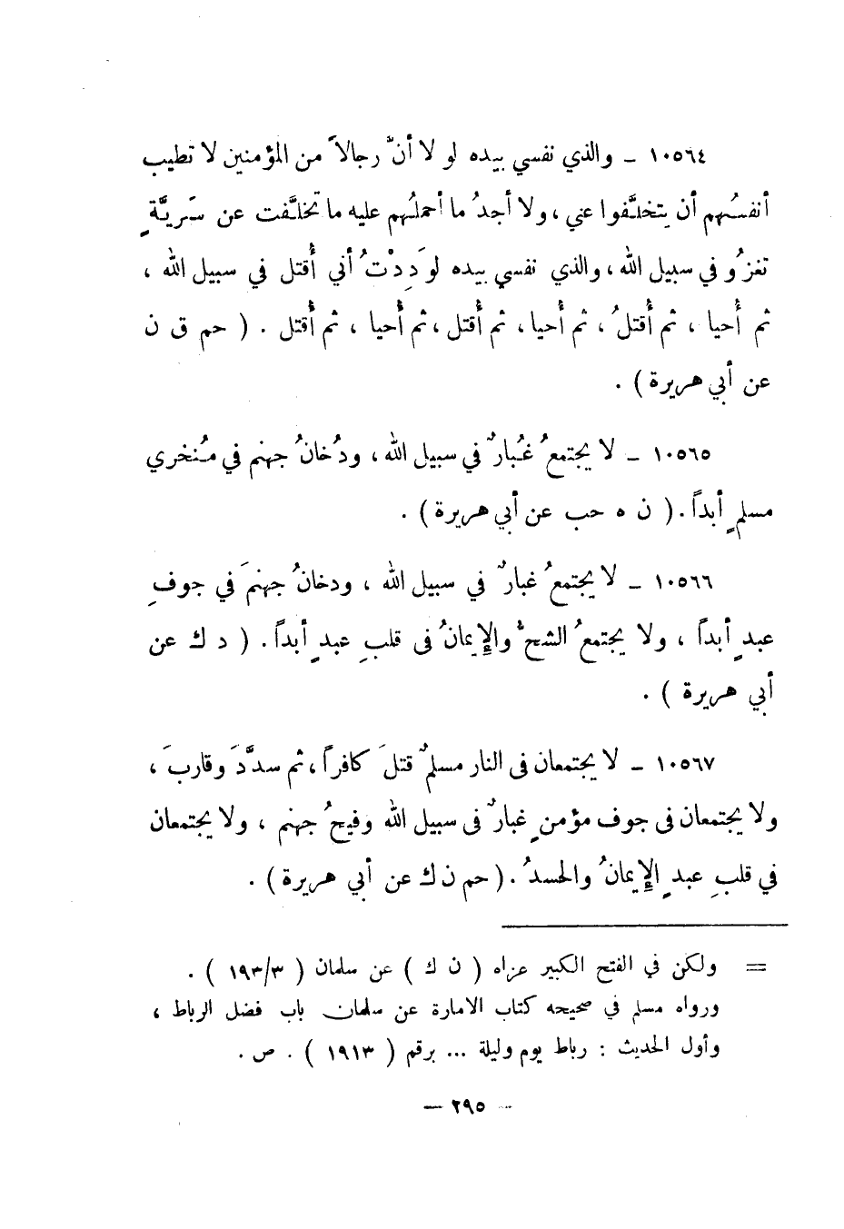 10564- "والذي نفسي بيده لولا أن رجالا من المؤمنين لا تطيب أنفسهم أن يتخلفوا عني، ولا أجد ما أحملهم عليه ما تخلفت عن سرية تغزو في سبيل الله، والذي نفسي بيده لوددت أني أقتل في سبيل الله، ثم أحيا، ثم أقتل، ثم أحيا، ثم أقتل، ثم أحيا، ثم أقتل". "حم ق ن عن أبي هريرة".