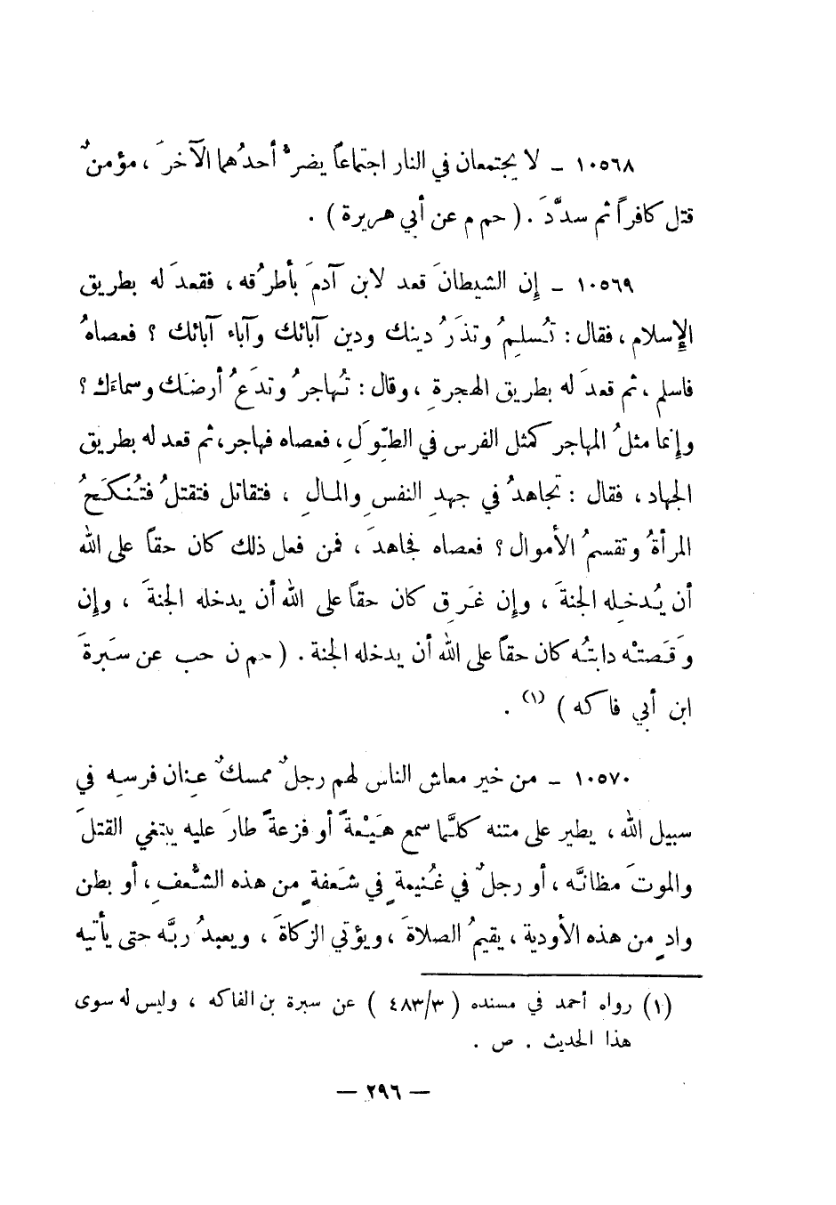 10569- "إن الشيطان قعد لابن آدم بأطرقه، فقعد له بطريق الإسلام، فقال: تسلم وتذر دينك ودين آبائك وآباء آبائك؟ فعصاه فأسلم، ثم قعد له بطريق الهجرة، وقال: تهاجر وتدع أرضك وسماءك؟ وإنما مثل المهاجر كمثل الفرس في الطول، فعصاه فهاجر، ثم قعد له بطريق الجهاد، فقال: تجاهد في جهد النفس والمال، فتقاتل فتقتل فتنكح المرأة وتقسم الأموال؟ فعصاه فجاهد، فمن فعل ذلك كان حقا على الله أن يدخله الجنة، وإن غرق كان حقا على الله أن يدخله الجنة، وإن وقصته دابته كان حقا على الله أن يدخله الجنة ". "حم ن حب عن سبرة ابن أبي فاكه"1.