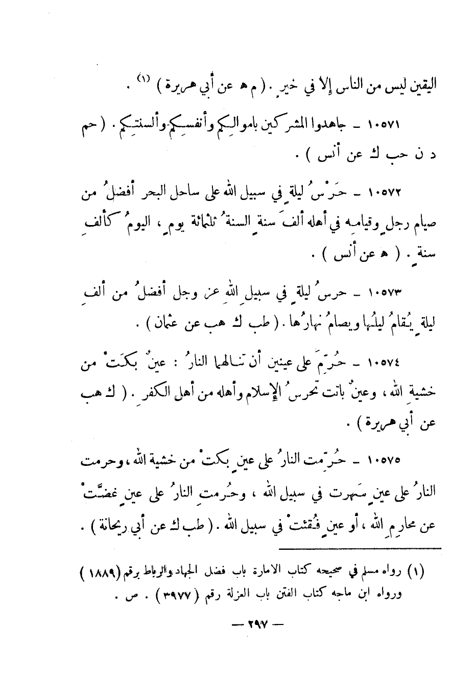 10573- "حرس ليلة في سبيل الله عز وجل أفضل من ألف ليلة يقام ليلها ويصام نهارها". "طب ك هب عن عثمان".