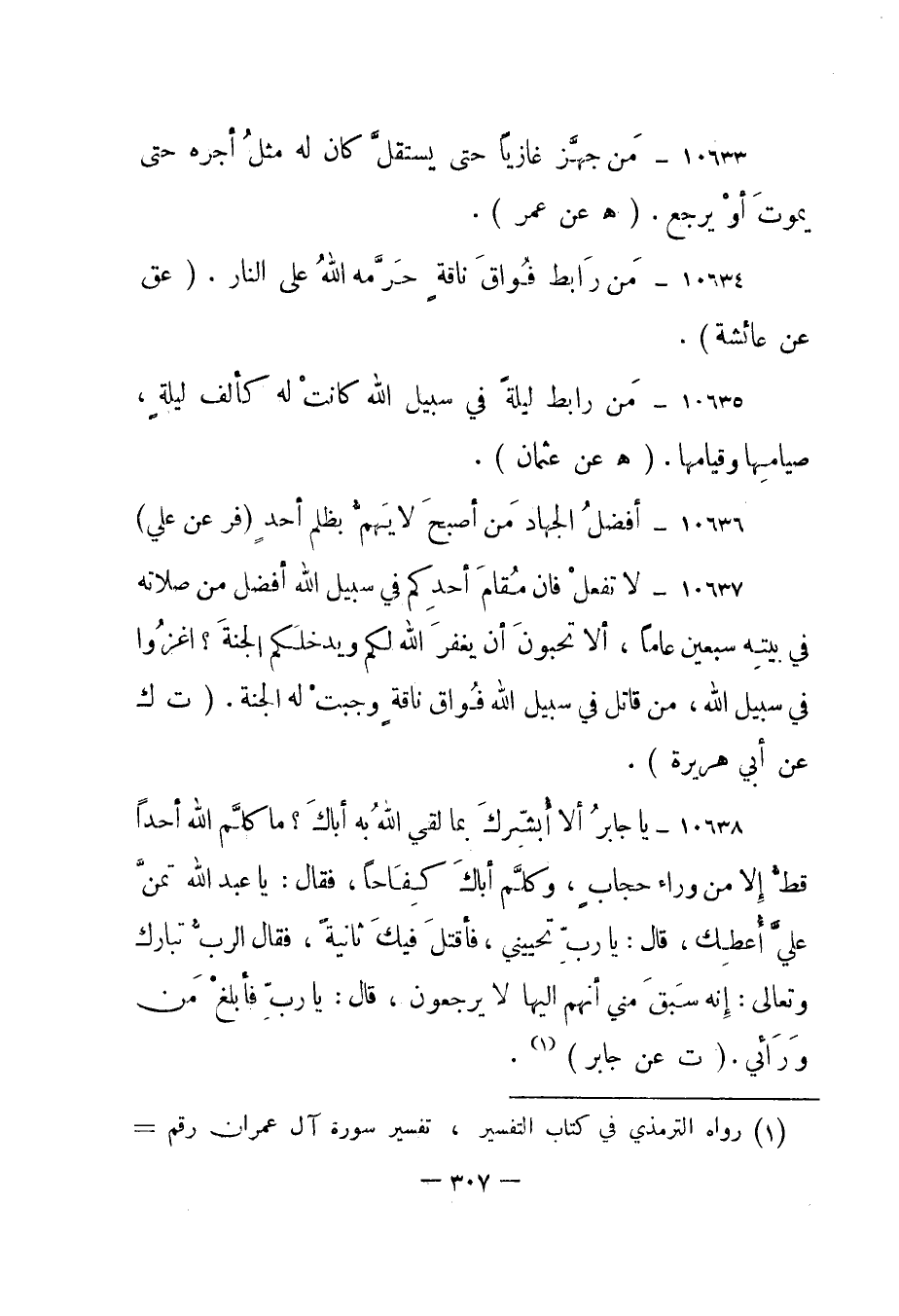 10635- "من رابط ليلة في سبيل الله كانت له كألف ليلة، صيامها وقيامها". "هـ عن عثمان".