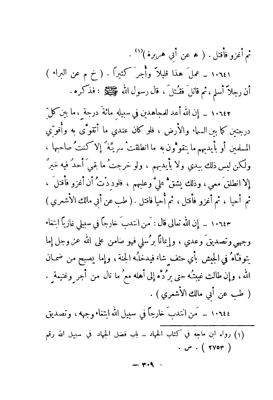 10644- "من انتدب خارجا في سبيل الله ابتغاء وجهه، وتصديق
