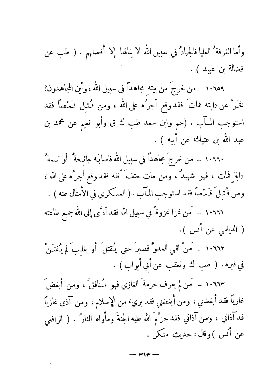10660- "من خرج مجاهدا في سبيل الله فأصابه جائحة أو لسعة دابة فمات، فهو شهيد، ومن مات حتف أنفه فقد وقع أجره على الله، ومن قتل قعصا فقد استوجب المآب". "العسكري في الأمثال عنه".