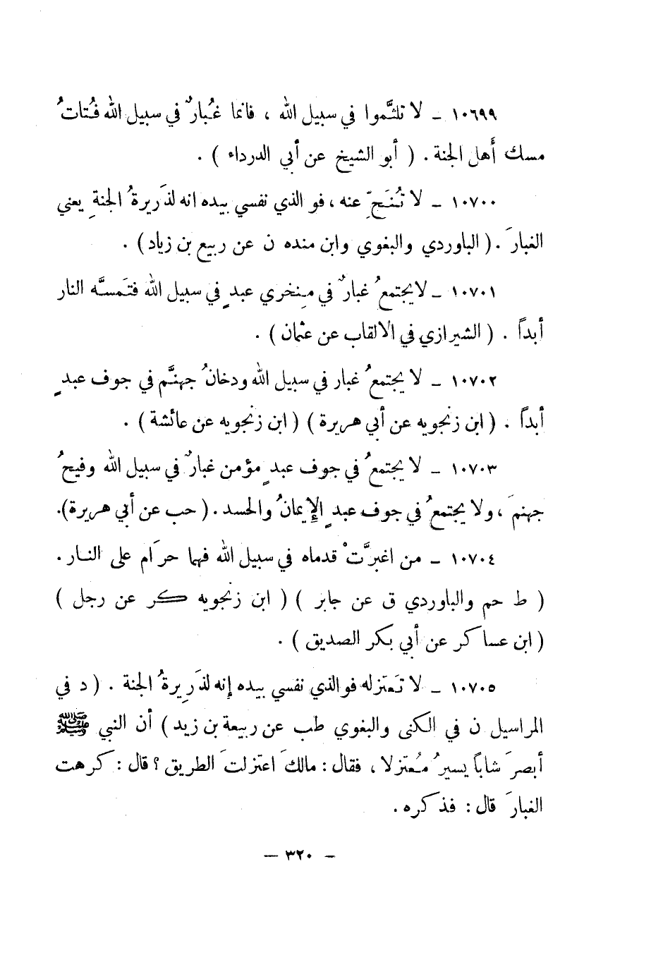 10701- "لا يجتمع غبار في منخري عبد في سبيل الله فتمسه النار أبدا". "الشيرازي في الألقاب عن عثمان".