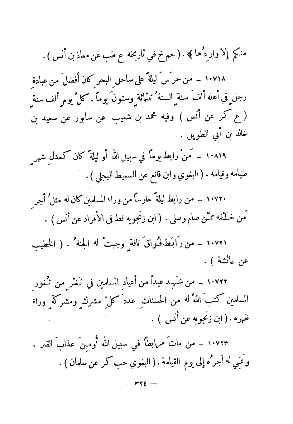 10720- "من رابط ليلة حارسا من وراء المسلمين كان له مثل أجر من خلفه ممن صام وصلى". "ابن زنجويه قط في الأفراد عن أنس".