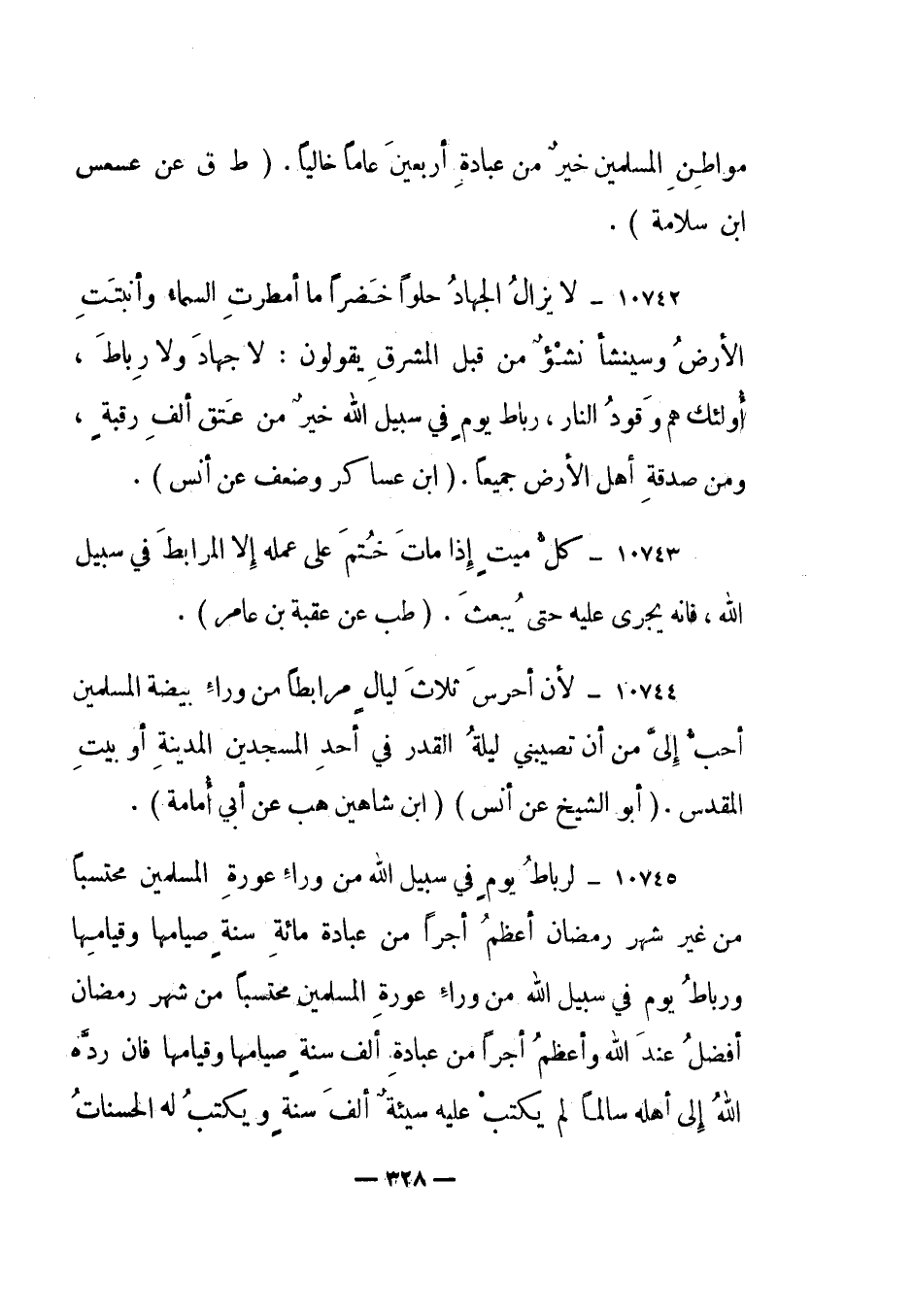 10744- "لأن أحرس ثلاث ليال مرابطا من وراء بيضة المسلمين أحب إلي من أن تصيبني ليلة القدر في أحد المسجدين المدينة أو بيت المقدس". "أبو الشيخ عن أنس" "ابن شاهين هب عن أبي أمامة".