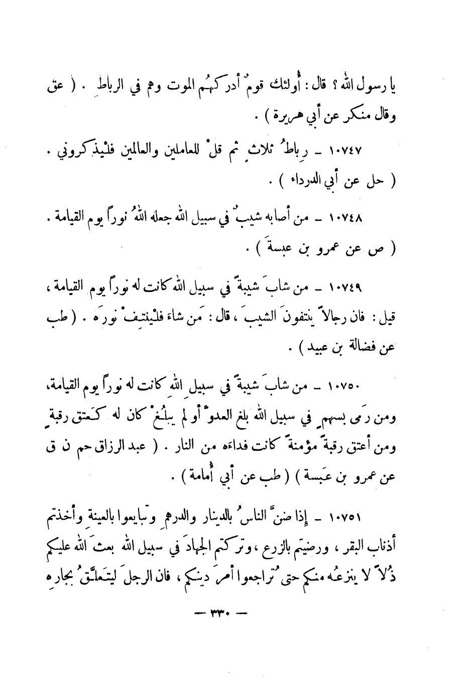 10748- "من أصابه شيب في سبيل الله جعله الله نورا يوم القيامة". "ص عن عمرو بن عبسة".