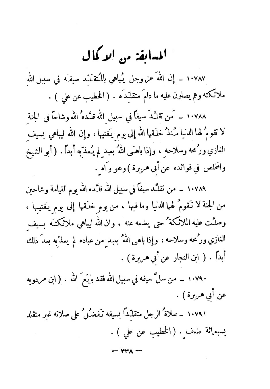 10787- "إن الله عز وجل يباهي بالمتقلد سيفه في سبيل الله ملائكته وهم يصلون عليه ما دام متقلده". "الخطيب عن علي".