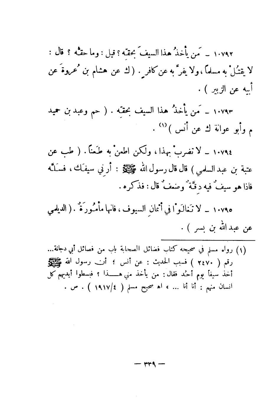 10793- "من يأخذ هذا السيف بحقه". "حم وعبد بن حميد م وأبو عوانة ك عن أنس"1.