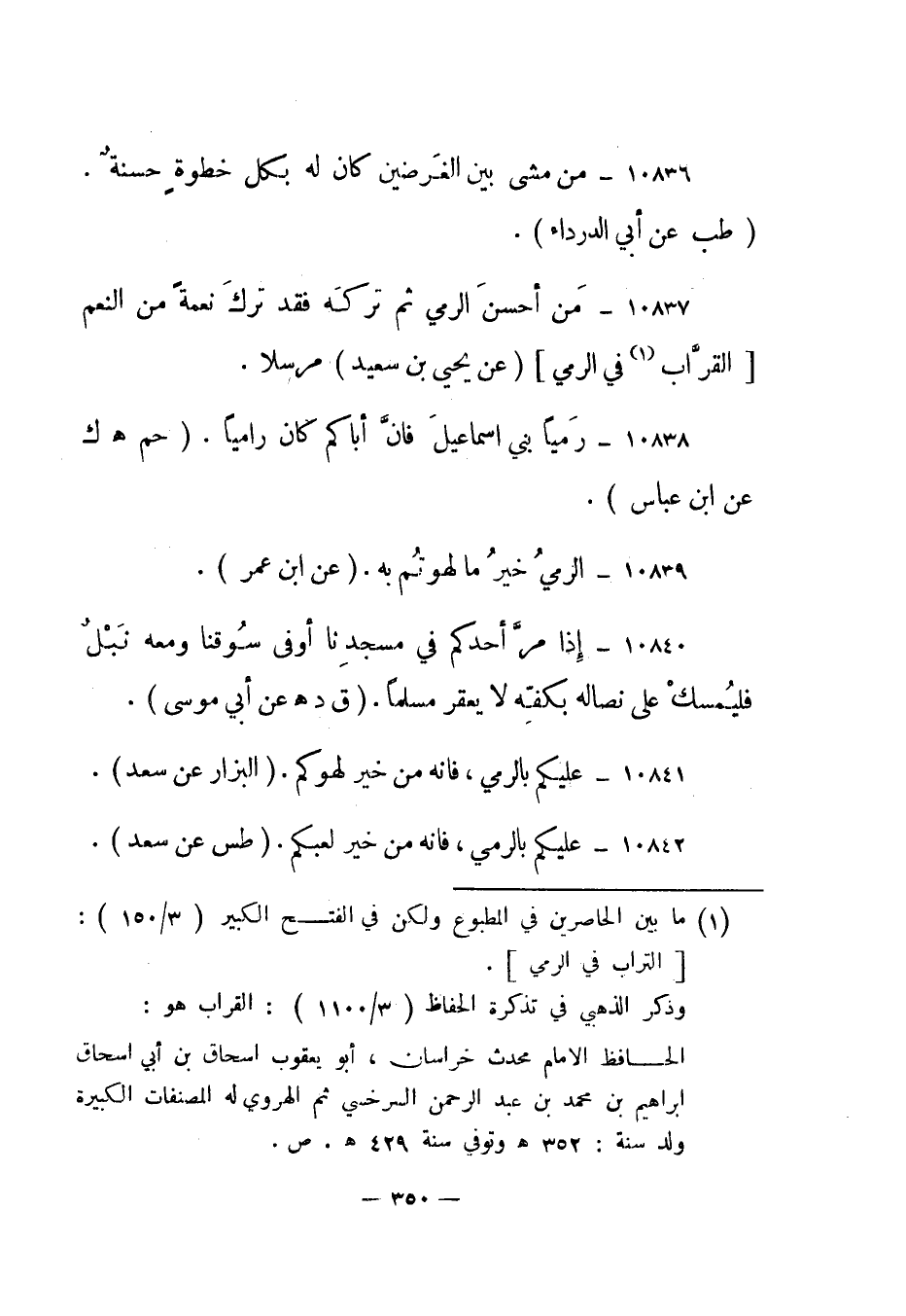 10837- "من أحسن الرمي ثم تركه فقد ترك نعمة من النعم [القراب 1 في الرمي] ". "عن يحيى بن سعيد" مرسلا.
