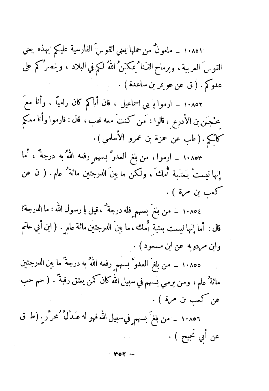 10855- "من بلغ العدو بسهم رفعه الله به درجة ما بين الدرجتين مائة عام، ومن يرمي بسهم في سبيل الله كان كمن يعتق رقبة". "حم حب عن كعب بن مرة".