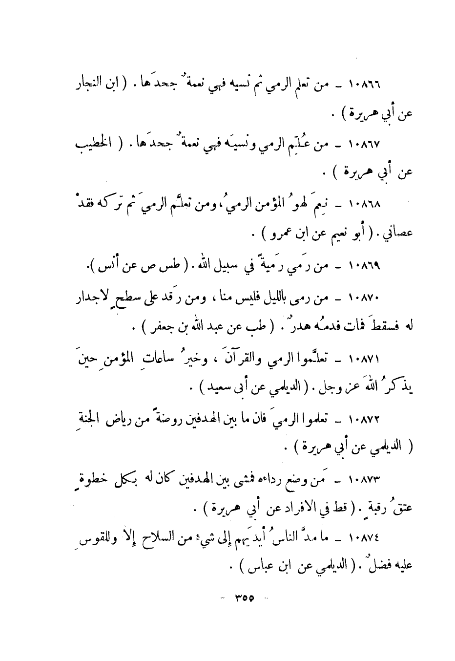 10872- "تعلموا الرمي فإن ما بين الهدفين روضة من رياض الجنة". "الديلمي عن أبي هريرة".