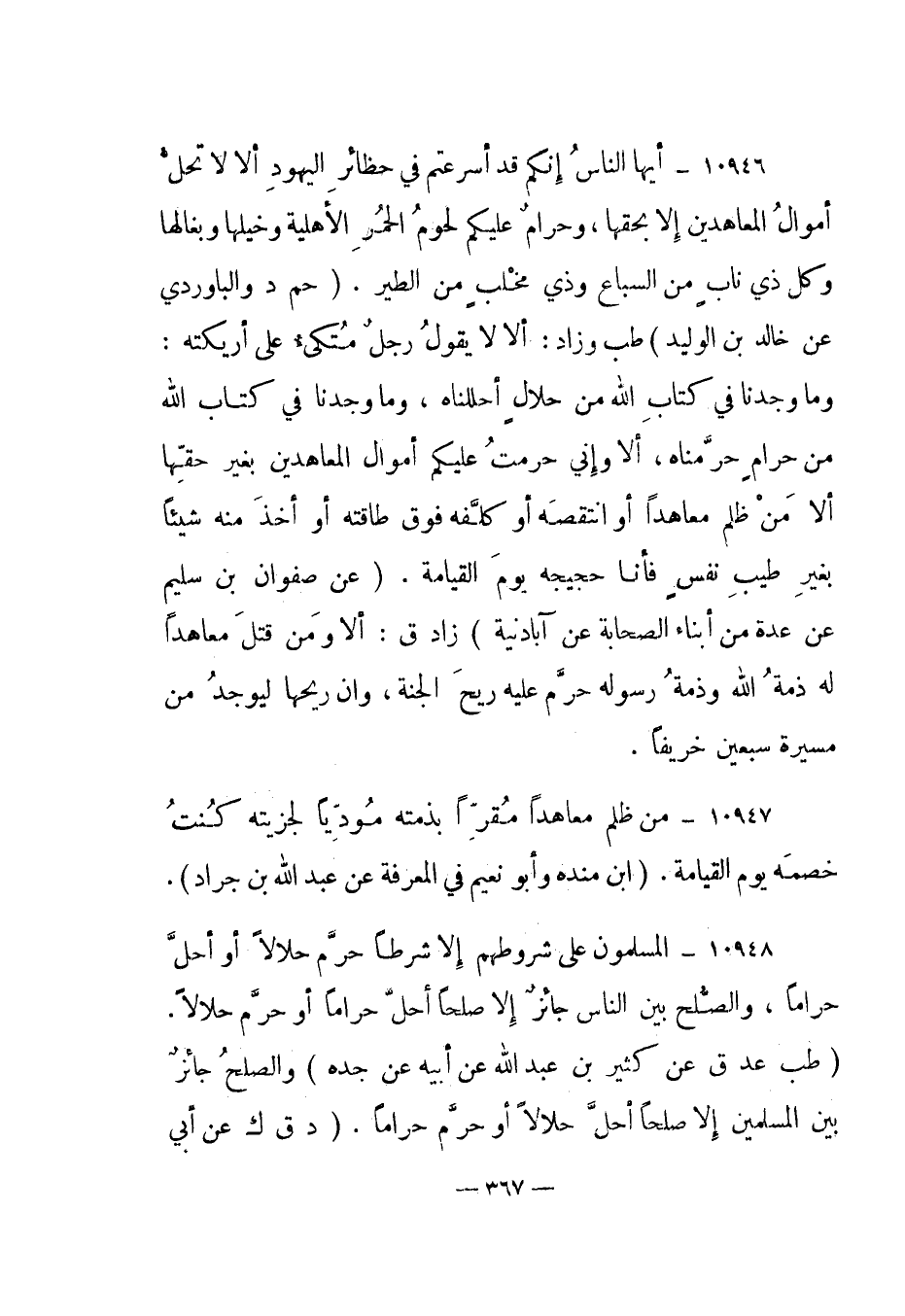 10946- "أيها الناس إنكم قد أسرعتم في حظائر اليهود ألا لا تحل أموال المعاهدين إلا بحقها، وحرام عليكم لحوم الحمر الأهلية وخيلها وبغالها وكل ذي ناب من السباع وذي مخلب من الطير. "حم د والبارودي عن خالد بن الوليد" طب وزاد: ألا لا يقول رجل متكئ على أريكته: وما وجدنا في كتاب الله من حلال أحللناه، وما وجدنا في كتاب الله من حرام حرمناه، ألا وإني حرمت عليكم أموال المعاهدين بغير حقها ألا من ظلم معاهدا أو انتقصه أو كلفه فوق طاقته أو أخذ منه شيئا بغير طيب نفس فأنا حجيجه يوم القيامة". "عن صفوان بن سليم عن عدة من أبناء الصحابة عن آبادنية" زاد ق: ألا ومن قتل معاهدا له ذمة الله وذمة رسوله حرم عليه ريح الجنة، وإن ريحها ليوجد من مسيرة سبعين خريفا.