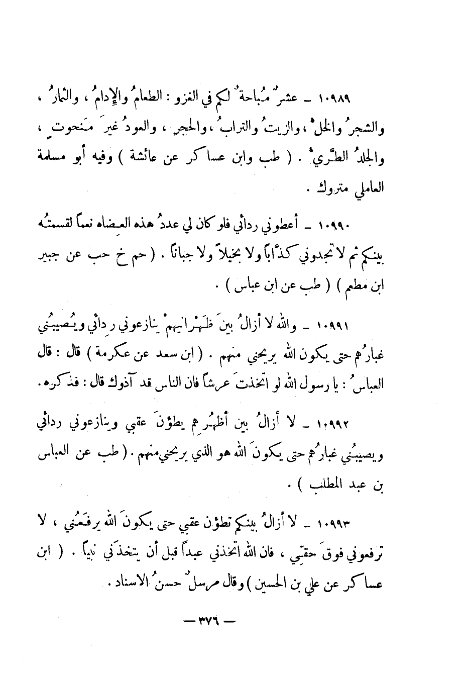 10992- "لا أزال بين أظهرهم يطؤن عقبي وينازعوني ردائي ويصيبني غبارهم حتى يكون الله هو الذي يريحني منهم". "طب عن العباس بن عبد المطلب".