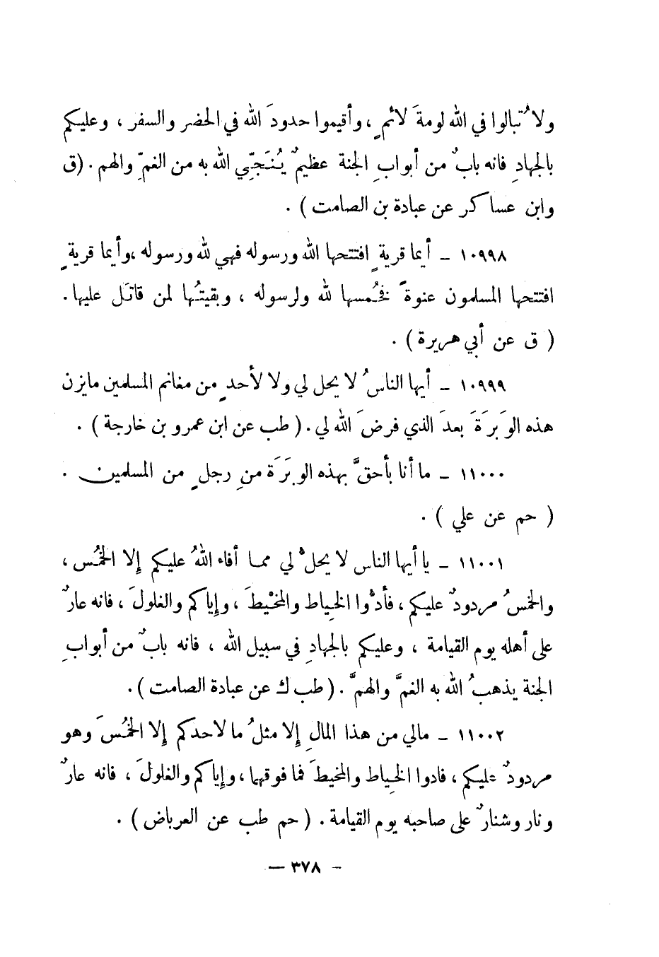 11001- "يا أيها الناس لا يحل لي مما أفاء الله عليكم إلا الخمس، والخمس مردود عليكم، فأدوا الخياط والمخيط، وإياكم والغلول، فإنه عار على أهله يوم القيامة، وعليكم بالجهاد في سبيل الله، فإنه باب من أبواب الجنة يذهب الله به الغم والهم". "طب ك عن عبادة بن الصامت".