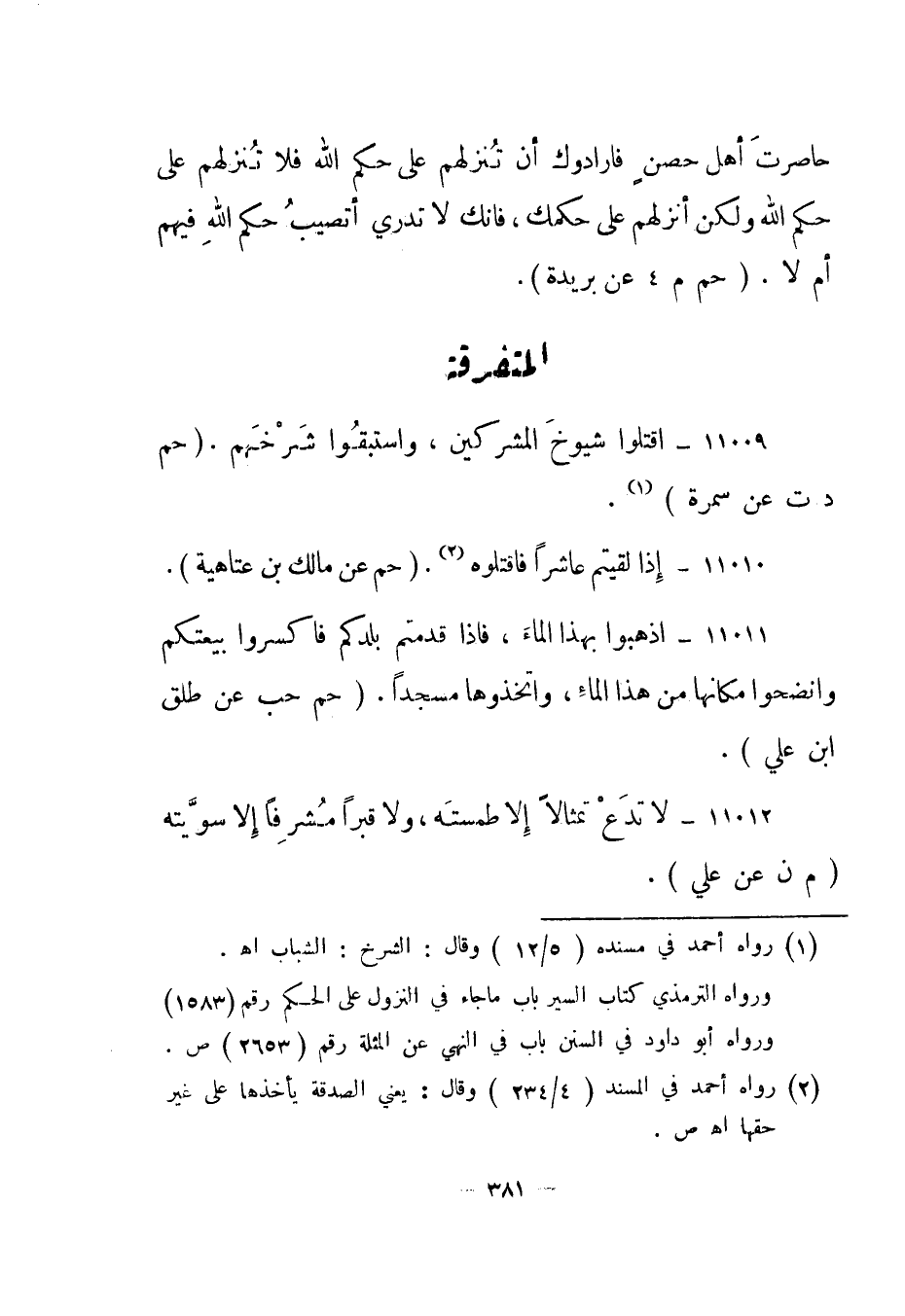 11012- "لا تدع تمثالا إلا طمسته، ولا قبرا مشرفا إلا سويته". "م ن عن علي"