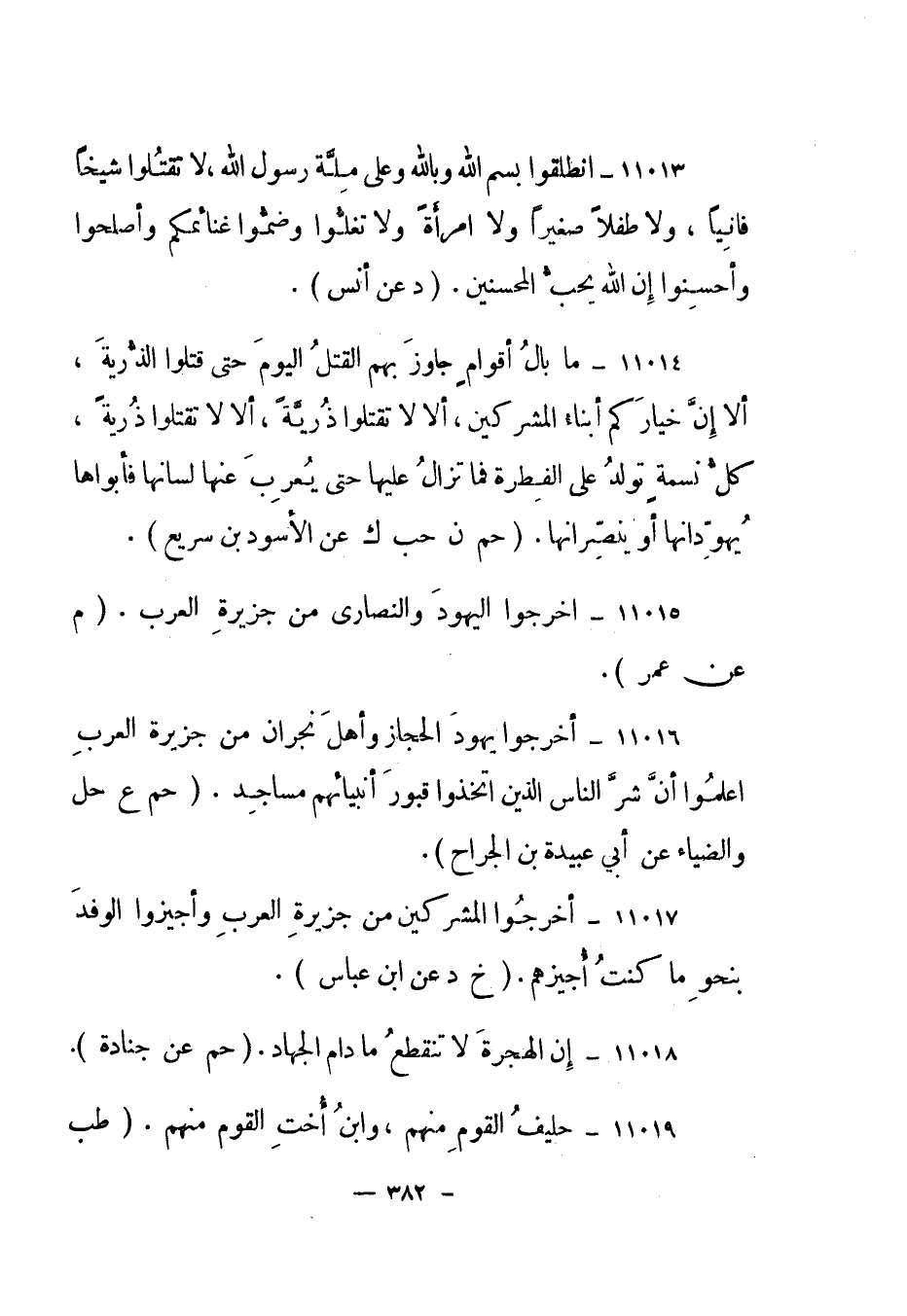 11016- "أخرجوا يهود الحجاز وأهل نجران من جزيرة العرب اعلموا أن شر الناس الذين اتخذوا قبور أنبيائهم مساجد". "حم ع حل والضياء عن أبي عبيدة بن الجراح".
