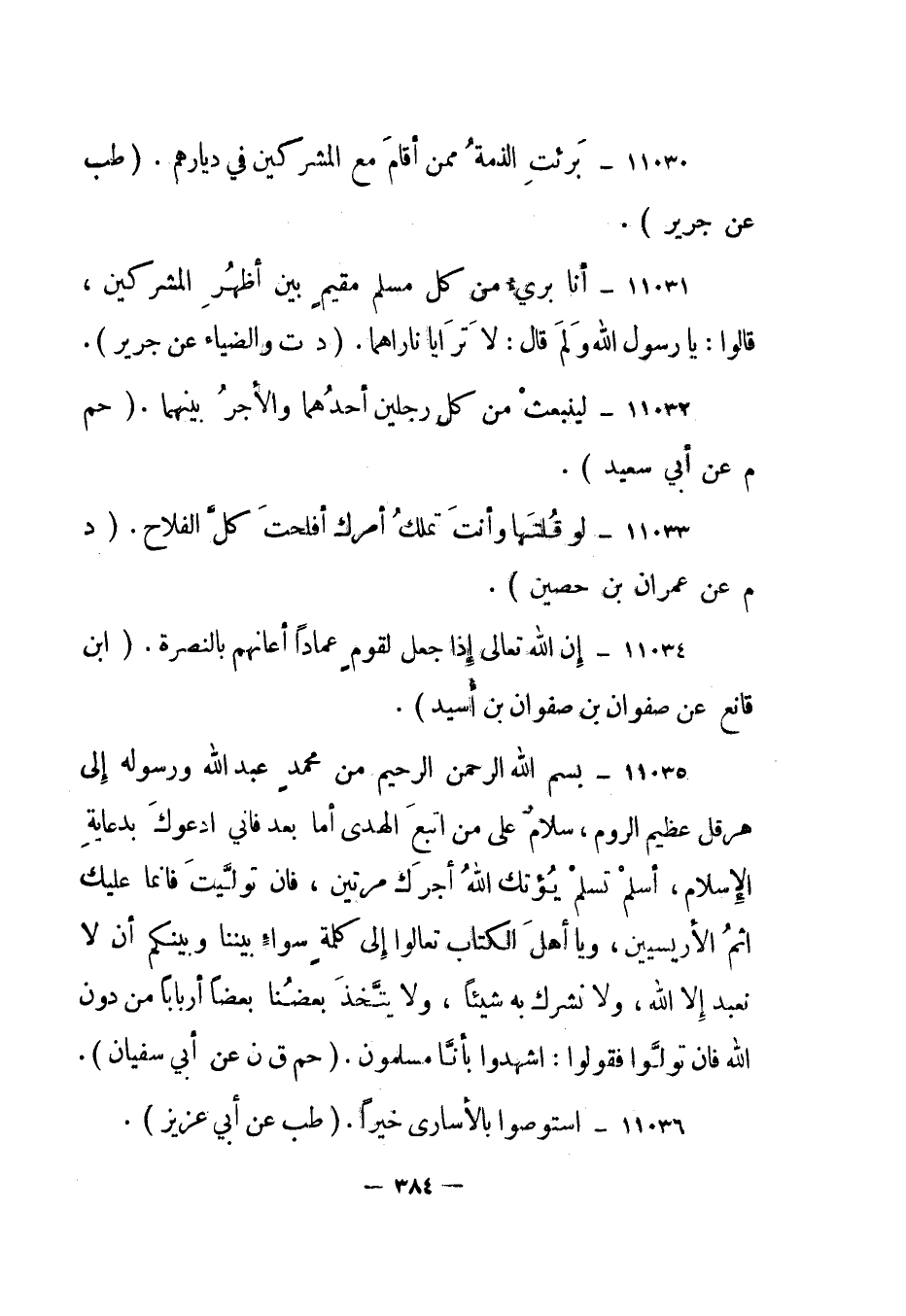 11035- "بِسْمِ اللَّهِ الرَّحْمَنِ الرَّحِيمِ من محمد عبد الله ورسوله إلى هرقل عظيم الروم، سلام على من اتبع الهدى أما بعد فإني أدعوك بدعاية الإسلام، أسلم تسلم يؤتك الله أجرك مرتين، فإن توليت فإنما عليك إثم الأريسين، ويا أهل الكتاب تعالوا إلى كلمة سواء بيننا وبينكم أن لا نعبد إلا الله، ولا نشرك به شيئا، ولا يتخذ بعضنا بعضا أربابا من دون الله فإن تولوا فقولوا: اشهدوا بأنا مسلمون". "حم ق ن عن أبي سفيان".