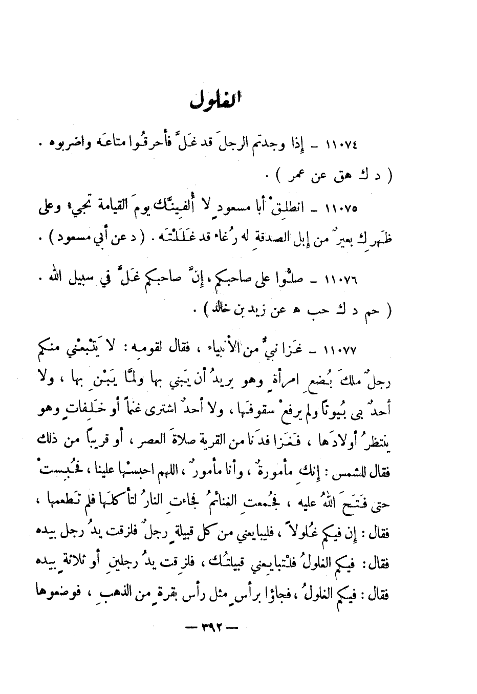 11077- "غزا نبي من الأنبياء، فقال لقومه: لا يتبعني منكم رجل ملك بضع امرأة وهو يريد أن يبني بها ولما يبن بها، ولا أحد بنى بيوتا ولم يرفع سقوفها، ولا أحد اشترى غنما أو خلفات وهو ينتظر أولادها، فغزا فدنا من القرية صلاة العصر، أو قريبا من ذلك فقال للشمس: إنك مأمورة، وأنا مأمور، اللهم احبسها علينا، فحبست حتى فتح الله عليه، فجمعت الغنائم فجاءت النار لتأكلها فلم تطعمها، فقال: إن فيكم غلولا، فليبايعني من كل قبيلة رجل فلزقت يد رجل بيده فقال: فيكم الغلول فلتبايعني قبيلتك، فلزقت يد رجلين أو ثلاثة بيده فقال: فيكم الغلول، فجاؤا برأس مثل رأس بقرة من الذهب، فوضعوها