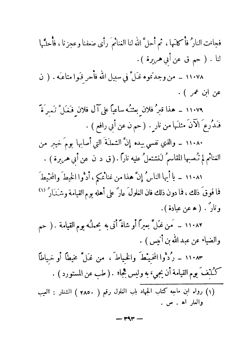 11081- "يا أيها الناس إن هذا من غنائمكم، أدوا الخيط والمخيط فما فوق ذلك، فما دون ذلك فإن الغلول عار على أهله يوم القيامة وشنار 1 ونار". "هـ عن عبادة".
