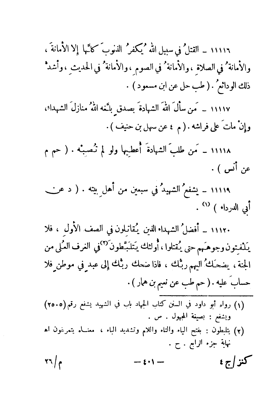 11117- "من سأل الله الشهادة بصدق بلغه الله منازل الشهداء، وإن مات على فراشه". "م 4 عن سهل بن حنيف".