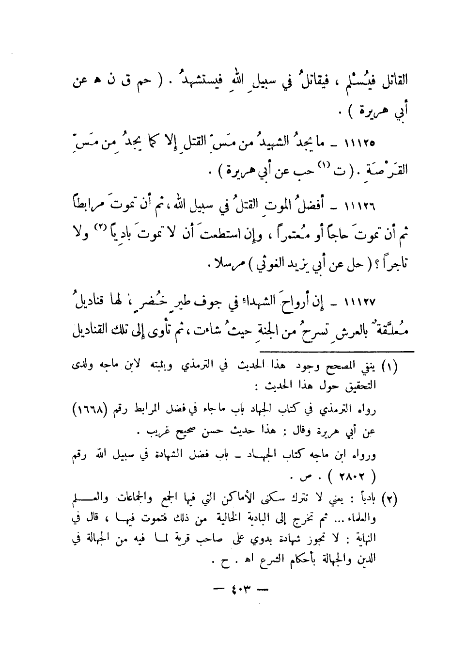 11127- "إن أرواح الشهداء في جوف طير خضر، لها قناديل معلقة بالعرش تسرح من الجنة حيث شاءت، ثم تأوى إلى تلك القناديل