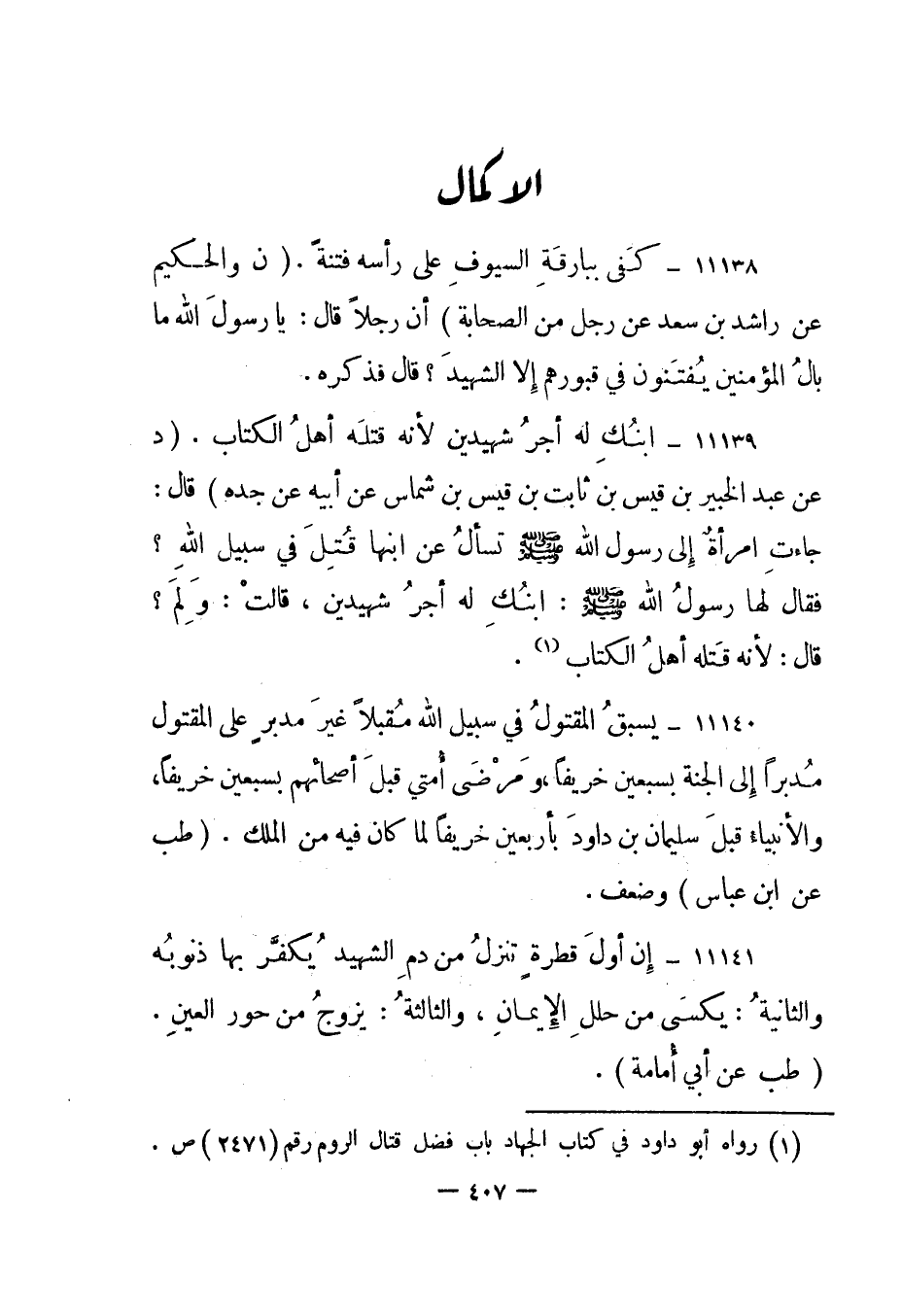 11139- "ابنك له أجر شهيدين لأنه قتله أهل الكتاب". "د عن عبد الخبير بن قيس بن ثابت بن قيس بن شماس عن أبيه عن جده" قال: " جاءت امرأة إلى رسول الله صلى الله عليه وسلم تسأل عن ابنها قتل في سبيل الله؟ فقال لها رسول الله صلى الله عليه وسلم: ابنك له أجر شهيدين، قالت: ولم؟ قال: لأنه قتله أهل الكتاب"1.