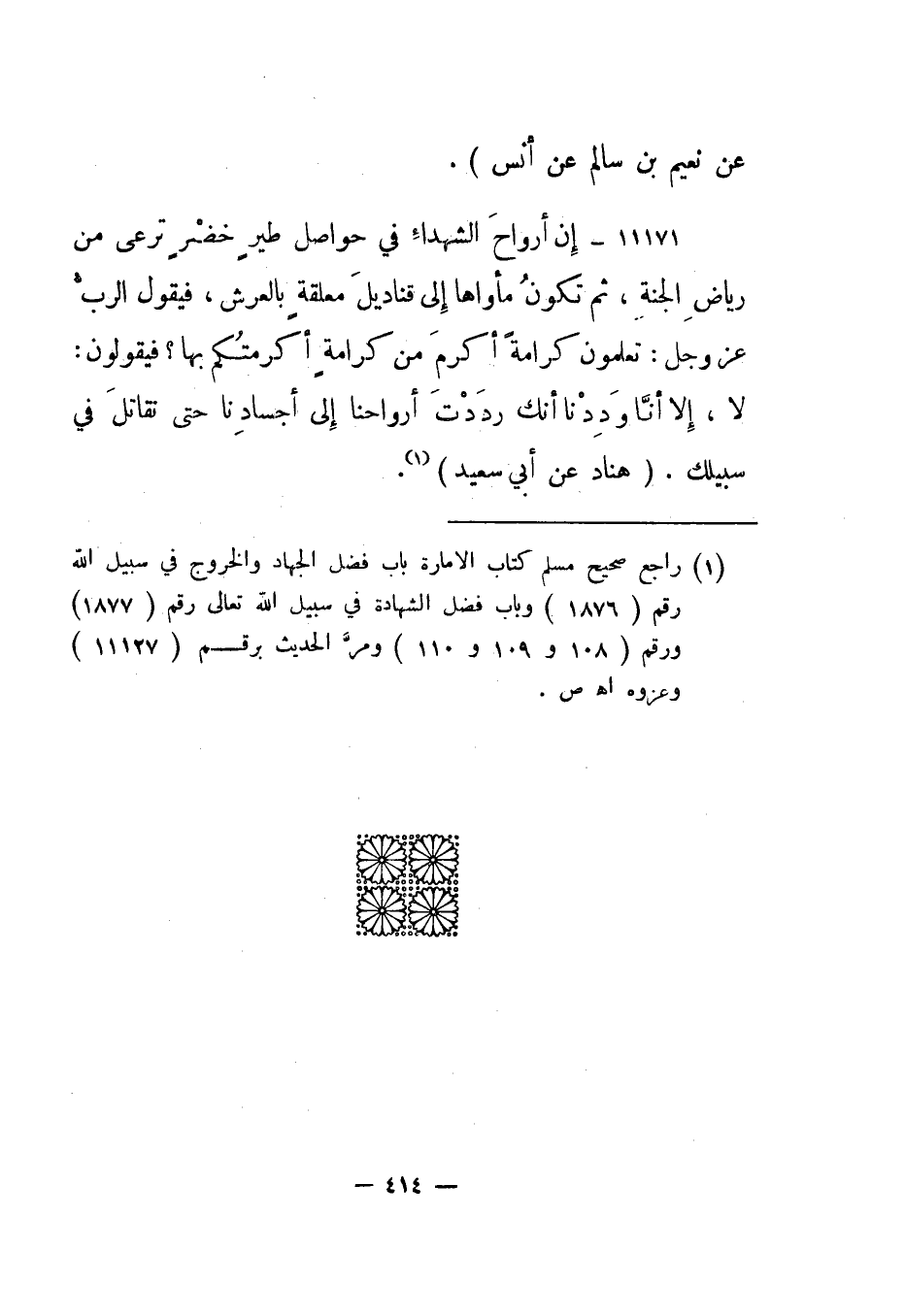 11171- "إن أرواح الشهداء في حواصل طير خضر ترعى من رياض الجنة، ثم تكون مأواها إلى قناديل معلقة بالعرش، فيقول الرب عز وجل: تعلمون كرامة أكرم من كرامة أكرمتكم بها؟ فيقولون: لا، إلا أنا وددنا أنك رددت أرواحنا إلى أجسادنا حتى نقاتل في سبيلك". "هناد عن أبي سعيد"1.