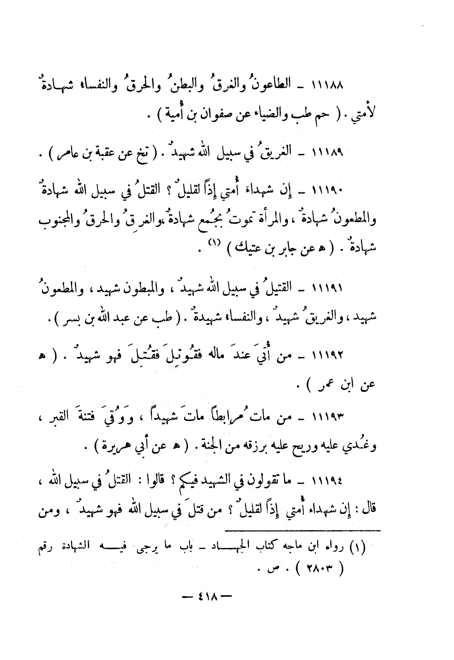11190- "إن شهداء أمتي إذا لقليل؟ القتل في سبيل الله شهادة والمطعون شهادة، والمرأة تموت بجمع شهادة، والغرق والحرق والمجنوب شهادة". "هـ عن جابر بن عتيك"1.
