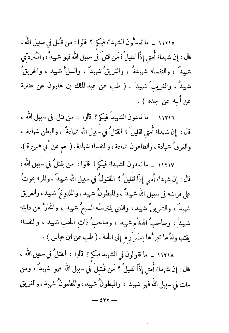 11218- "ما تقولون في الشهيد فيكم؟ قالوا: القتل في سبيل الله، قال: إن شهداء أمتي إذا لقليل؟ من قتل في سبيل الله فهو شهيد، ومن مات في سبيل الله فهو شهيد، والمبطون شهيد، والمطعون شهيد، والغريق