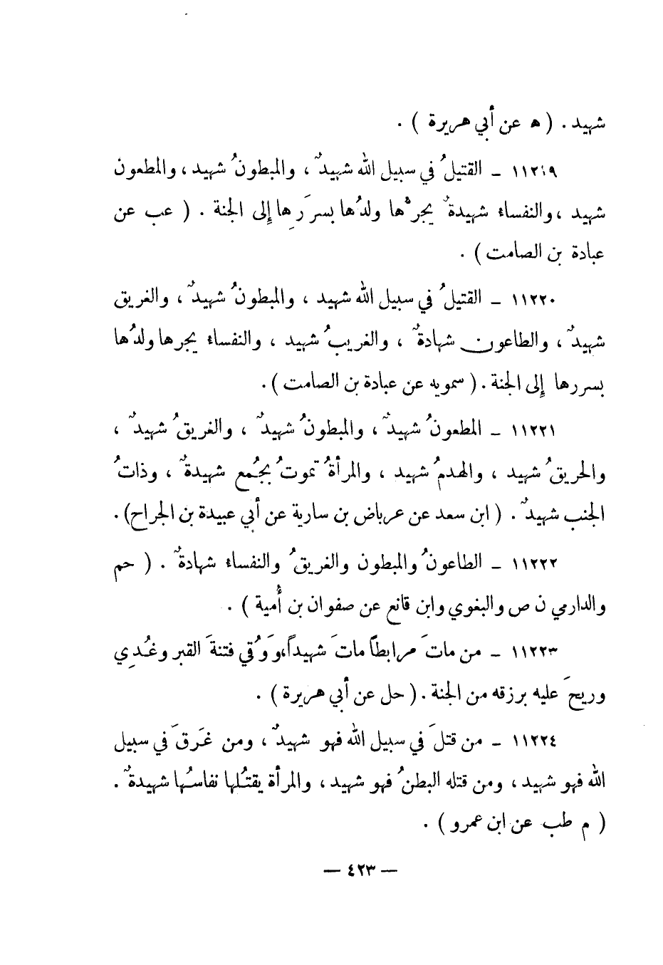 11219- "القتيل في سبيل الله شهيد، والمبطون شهيد، والمطعون شهيد، والنفساء شهيدة يجرها ولدها بسررها إلى الجنة". "عب عن عبادة بن الصامت".