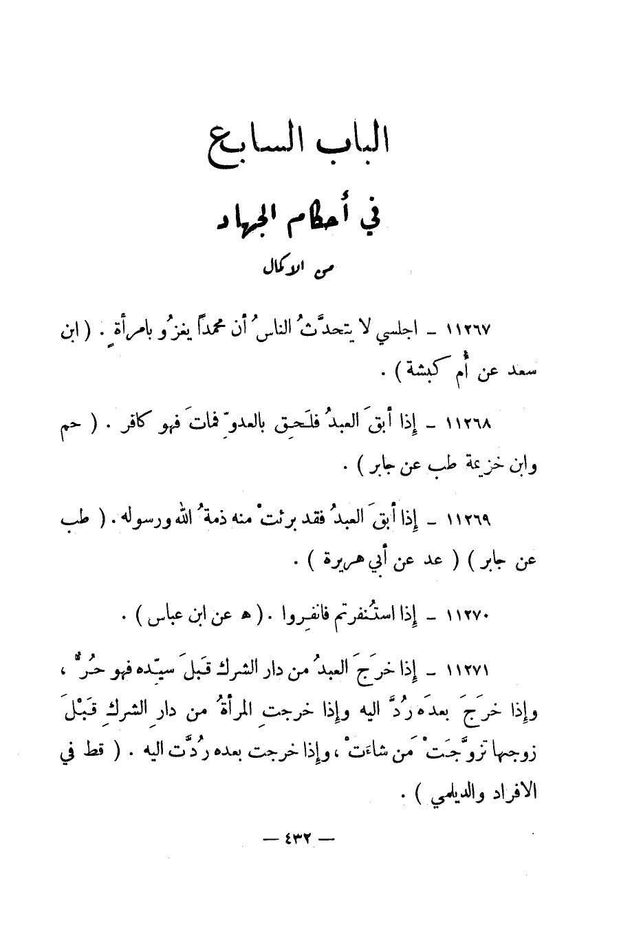 11271- "إذا خرج العبد من دار الشرك قبل سيده فهو حر، وإذا خرج بعده رد إليه وإذا خرجت المرأة من دار الشرك قبل زوجها تزوجت من شاءت، وإذا خرجت بعده ردت إليه". "قط في الأفراد والديلمي".