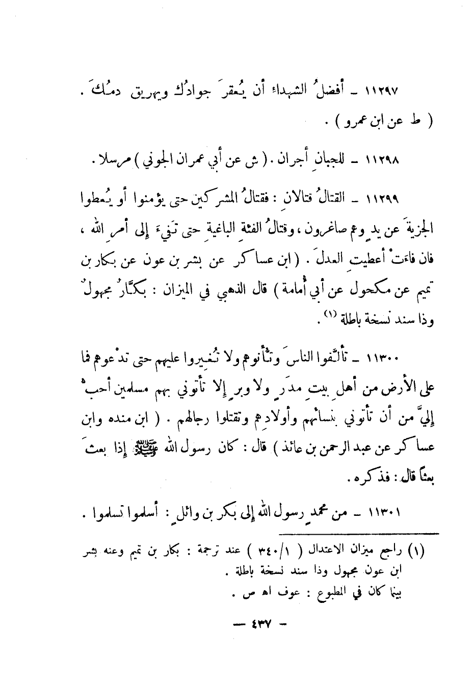 11299- "القتال قتالان: فقتال المشركين حتى يؤمنوا أو يعطوا الجزية عن يد وهم صاغرون، وقتال الفئة الباغية حتى تفيء إلى أمر الله، فإن فاءت أعطيت العدل". "ابن عساكر عن بشر بن عون عن بكار بن تميم عن مكحول عن أبي أمامة" قال الذهبي في الميزان: بكار مجهول وذا سند نسخة باطلة1.
