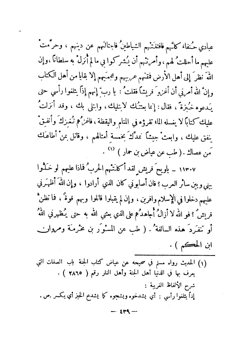 عبادي حنفاء كلهم فافتنتهم الشياطين فاجتالتهم عن دينهم، وحرمت عليهم ما أحللت لهم، وأمرتهم أن يشركوا بي ما لم أنزل به سلطانا، وإن الله نظر إلى أهل الأرض فمقتهم عربيهم وعجميهم إلا بقايا من أهل الكتاب وإن الله أمرني أن أغزو قريشا فقلت: يا رب إنهم إذا يثلغوا رأسي حتى يدعوه خبزة، فقال: إنما بعثتك لأبتليك، وابتلى بك، وقد أنزلت عليك كتابا لا يغسله الماء تقرؤه في المنام واليقظة، فاغزهم نغزك وأنفق ينفق عليك، وابعث جيشا نمدك بخمسة أمثالهم، وقاتل بمن أطاعك من عصاك". "طب عن عياض بن حمار"1.
