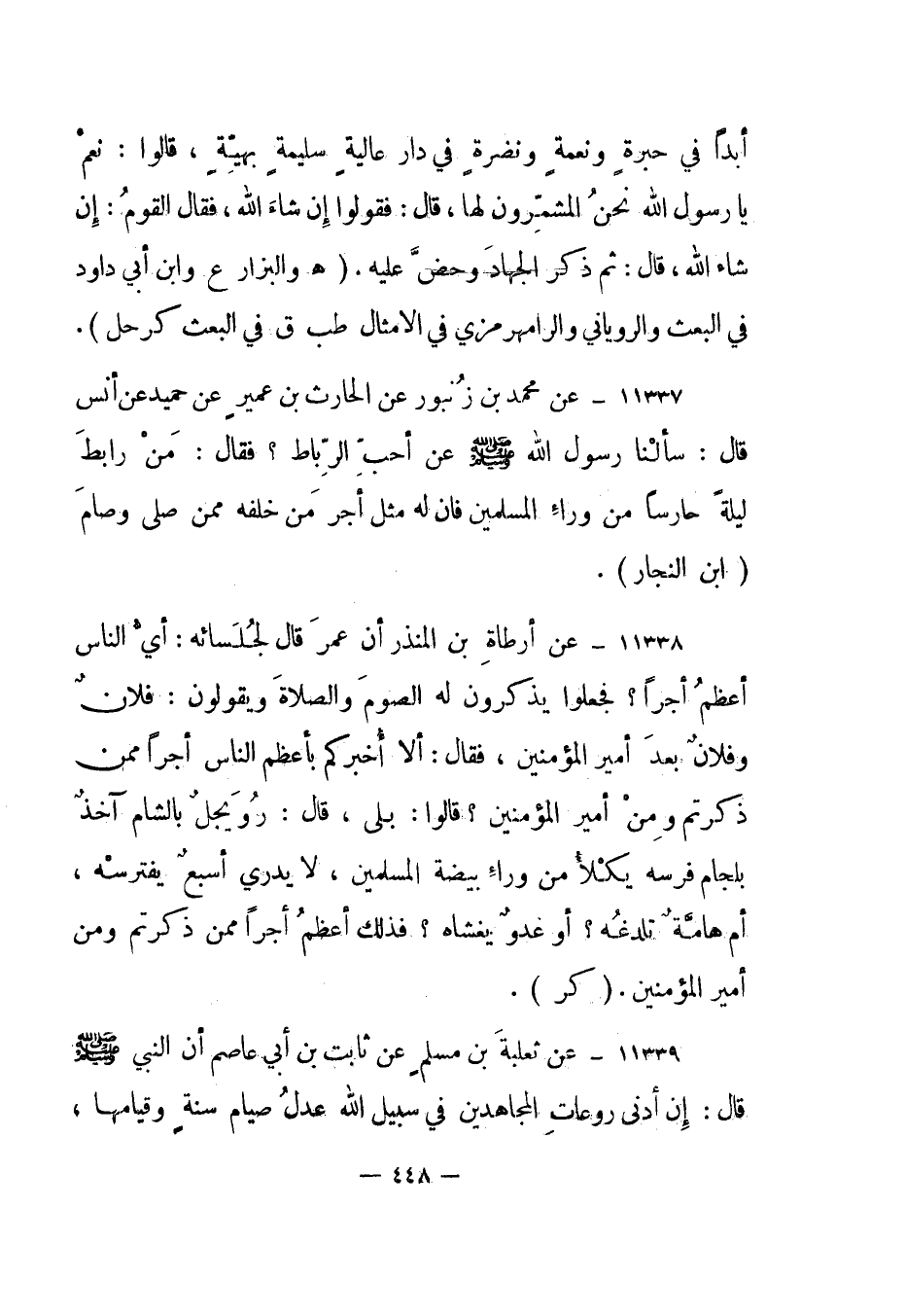 11339- عن ثعلبة بن مسلم عن ثابت بن أبي عاصم أن النبي صلى الله عليه وسلم قال: إن أدنى روعات المجاهدين في سبيل الله عدل صيام سنة وقيامها،