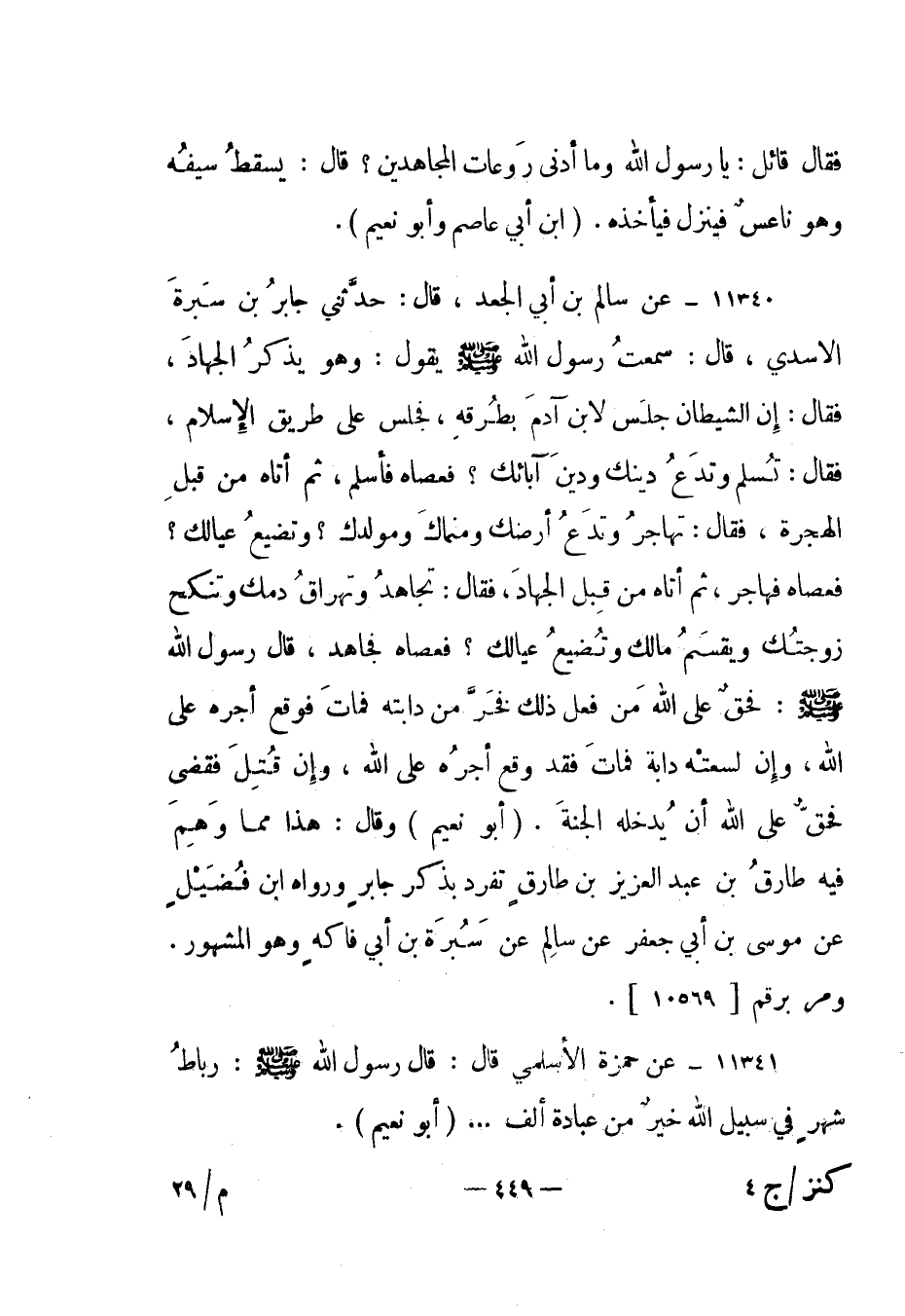 11340- عن سالم بن أبي الجعد، قال: حدثني جابر بن سبرة الأسدي، قال: سمعت رسول الله صلى الله عليه وسلم يقول: وهو يذكر الجهاد، فقال: إن الشيطان جلس لابن آدم بطرقه، فجلس على طريق الإسلام، فقال: تسلم وتدع دينك ودين آبائك؟ فعصاه فأسلم، ثم أتاه من قبل الهجرة، فقال: تهاجر وتدع أرضك ومنماك ومولدك؟ وتضيع عيالك؟ فعصاه فهاجر، ثم أتاه من قبل الجهاد، فقال: تجاهد وتهراق دمك وتنكح زوجتك ويقسم مالك وتضيع عيالك؟ فعصاه فجاهد، قال رسول الله صلى الله عليه وسلم: فحق على الله من فعل ذلك فخر من دابته فمات فوقع أجره على الله، وإن لسعته دابة فمات فقد وقع أجره على الله، وإن قتل فقضى فحق على الله أن يدخله الجنة. "أبو نعيم" وقال: هذا مما وهم فيه طارق بن عبد العزيز بن طارق تفرد بذكر جابر ورواه ابن فضيل عن موسى بن أبي جعفر عن سالم عن سبرة بن أبي فاكه وهو المشهور. ومر برقم [10569] .