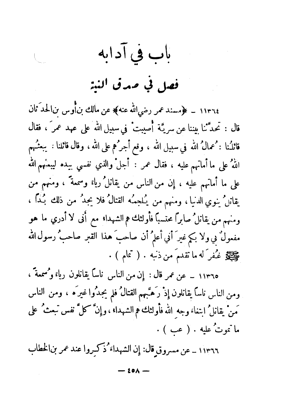 11364- "مسند عمر رضي الله عنه" عن مالك بن أوس بن الحدثان قال: تحدثنا بيننا عن سرية أصيبت في سبيل الله على عهد عمر، فقال قائلنا: عمال الله في سبيل الله، وقع أجرهم على الله، وقال قائلنا: يبعثهم الله على ما أماتهم عليه، فقال عمر: أجل والذي نفسي بيده ليبعثهم الله على ما أماتهم عليه، إن من الناس من يقاتل رياء وسمعة، ومنهم من يقاتل ينوي الدنيا، ومنهم من يلجمه القتال فلا يجد من ذلك بدا، ومنهم من يقاتل صابرا محتسبا فأولئك هم الشهداء مع أني لا أدري ما هو مفعول بي ولا بكم غير أني أعلم أن صاحب هذا القبر صاحب رسول الله صلى الله عليه وسلم غفر له ما تقدم من ذنبه. "تمام".